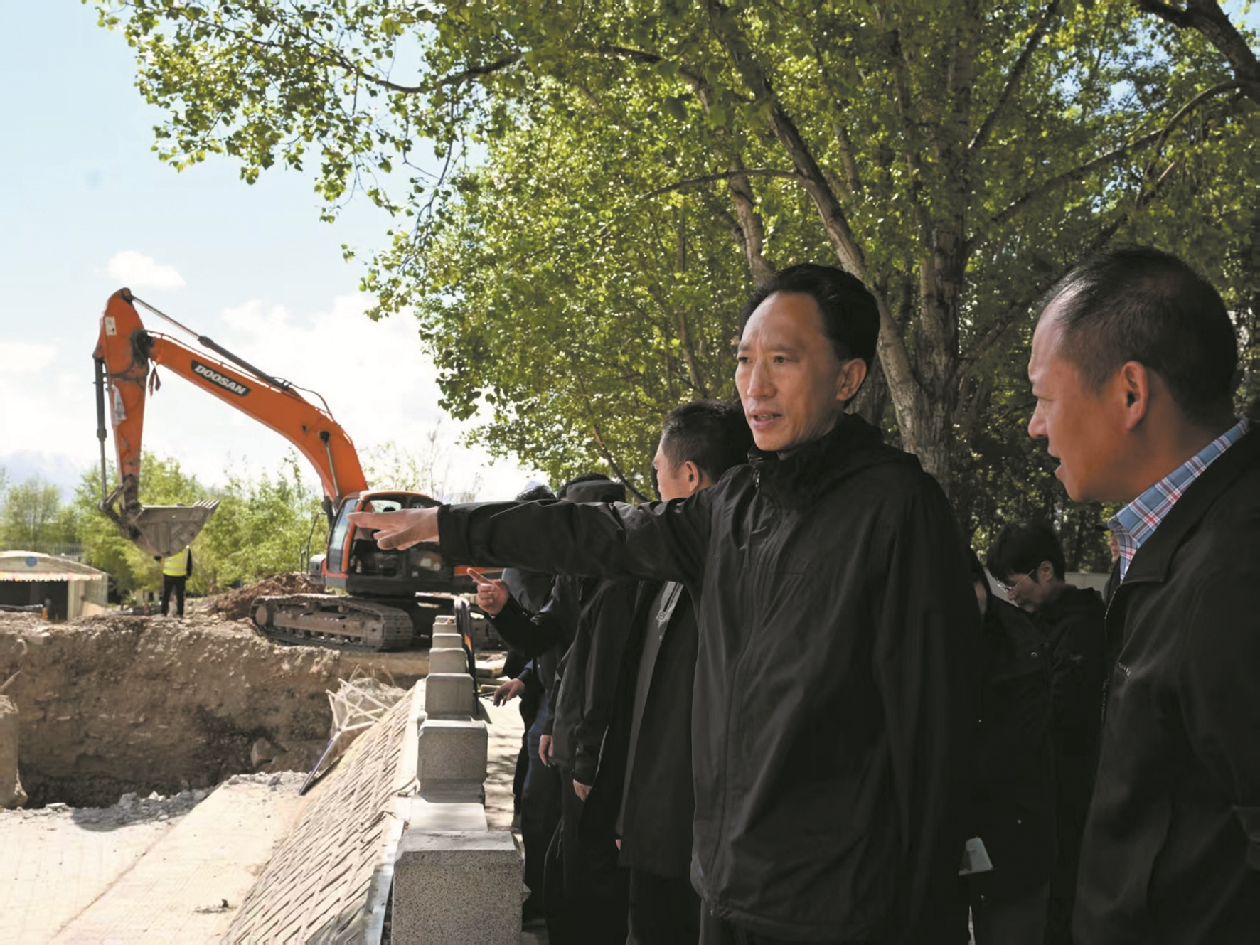 5月5日下午,自治区党委常委、拉萨市委书记肖友才深入城市建设项目一线,实地督进度、现场疏堵点。这是肖友才在金珠东路调研督导。 拉萨融媒记者 巴桑次仁摄