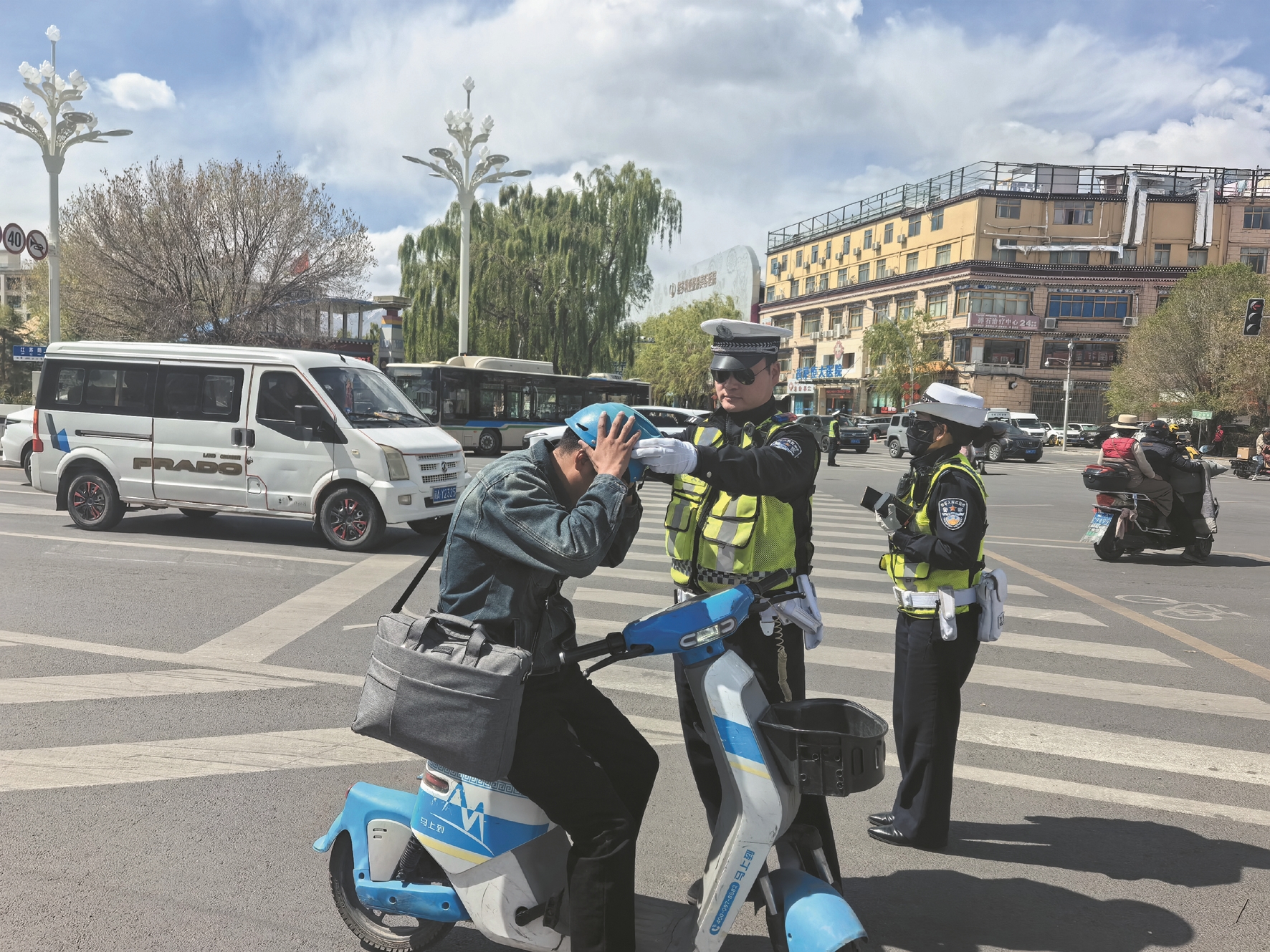 图为交警在市区主干道进行交通疏导。拉萨融媒记者 格桑卓嘎摄