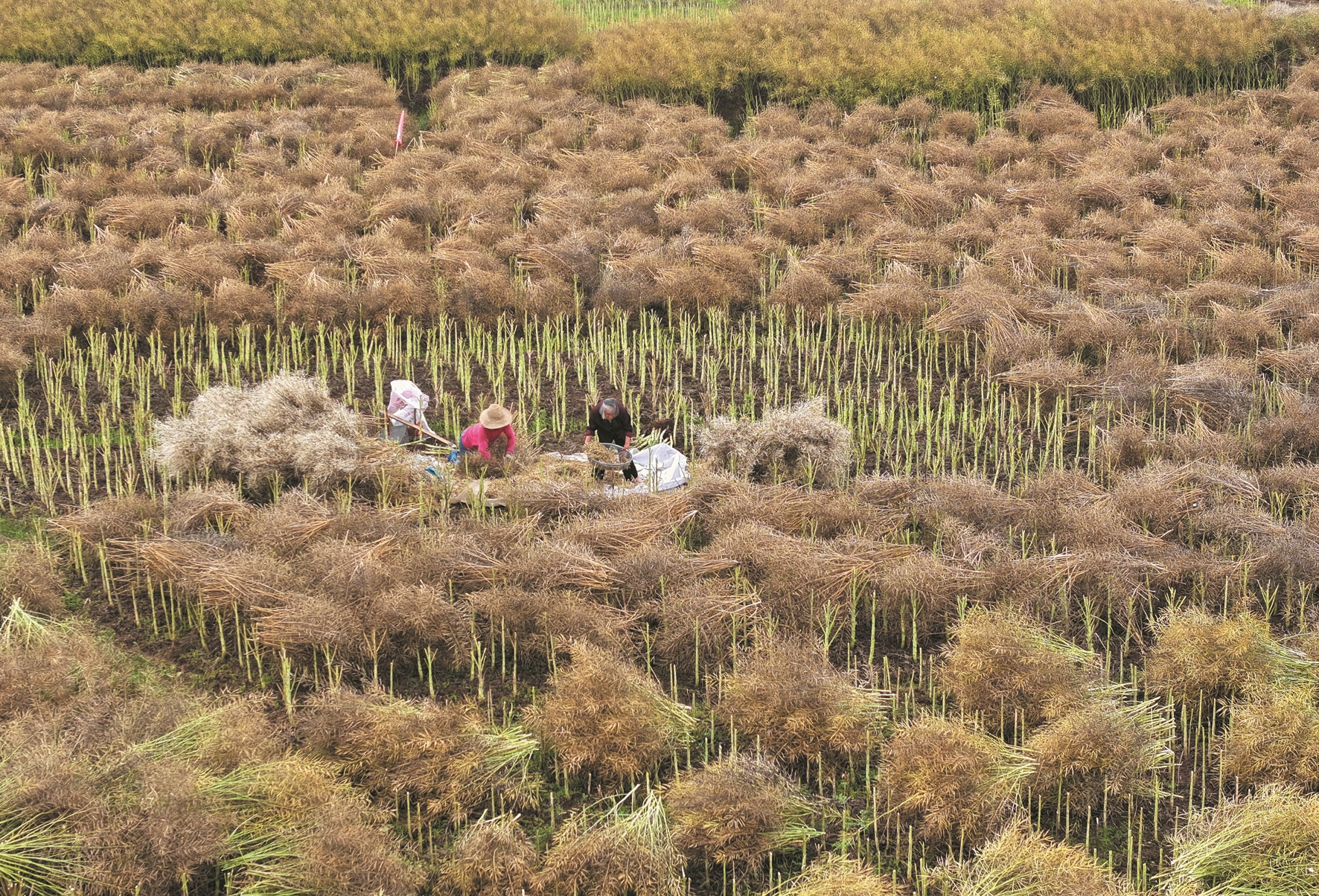图③为5月6日,在湖南省衡阳市祁东县归阳镇,当地村民在田间采收油菜(无人机照片)。