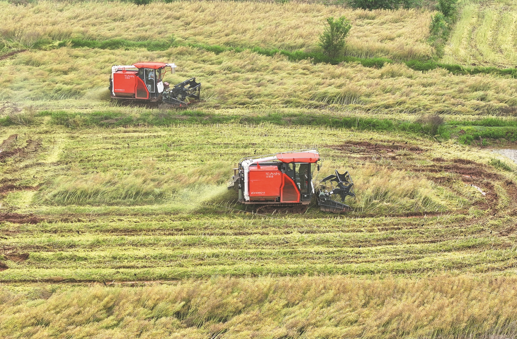 图②为5月6日,在湖南省衡阳市祁东县归阳镇,当地村民驾驶农机在田间收割油菜(无人机照片)。