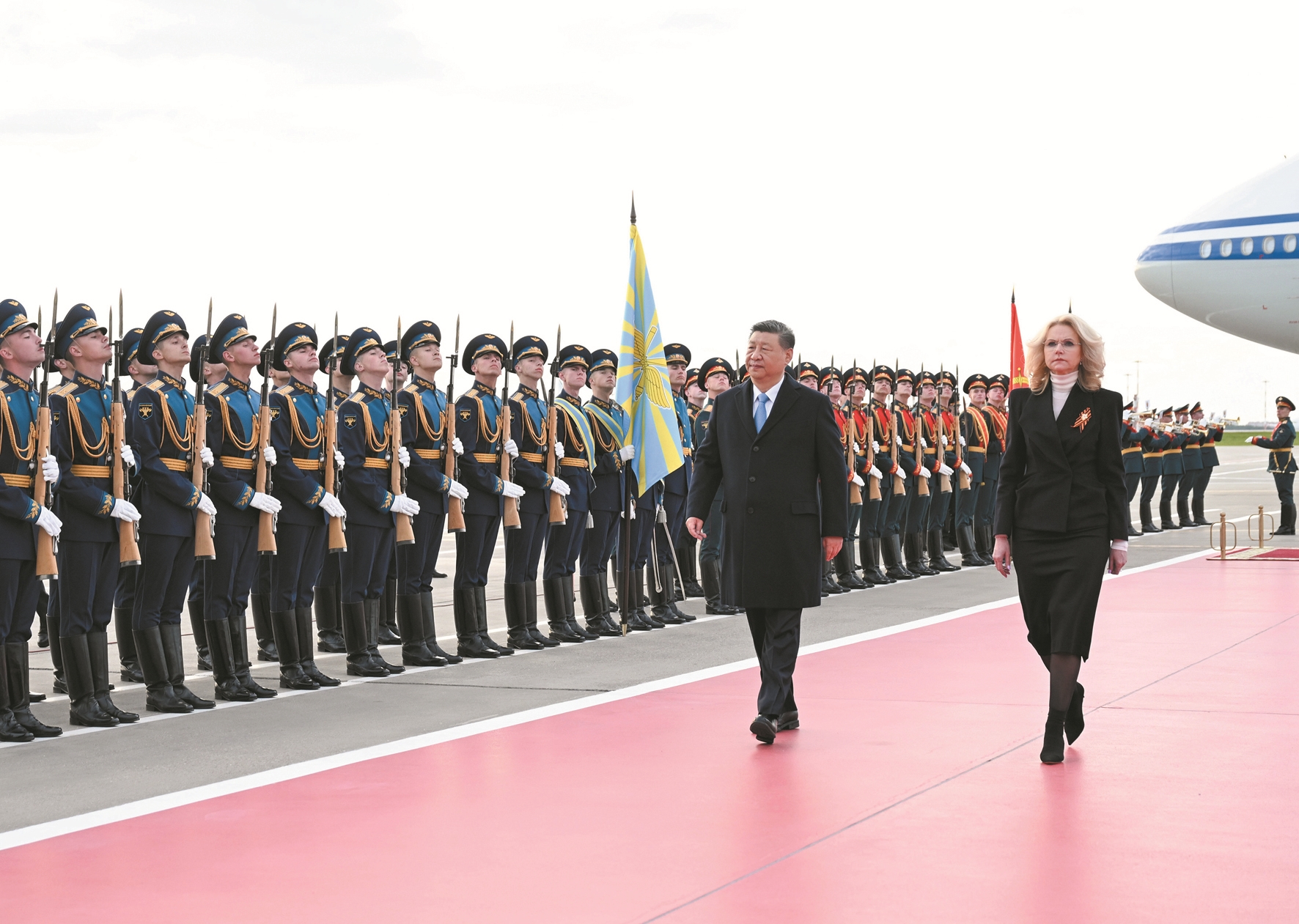 俄方在机场举行隆重迎接仪式。军乐团奏中俄两国国歌。习近平检阅仪仗队并观看分列式。