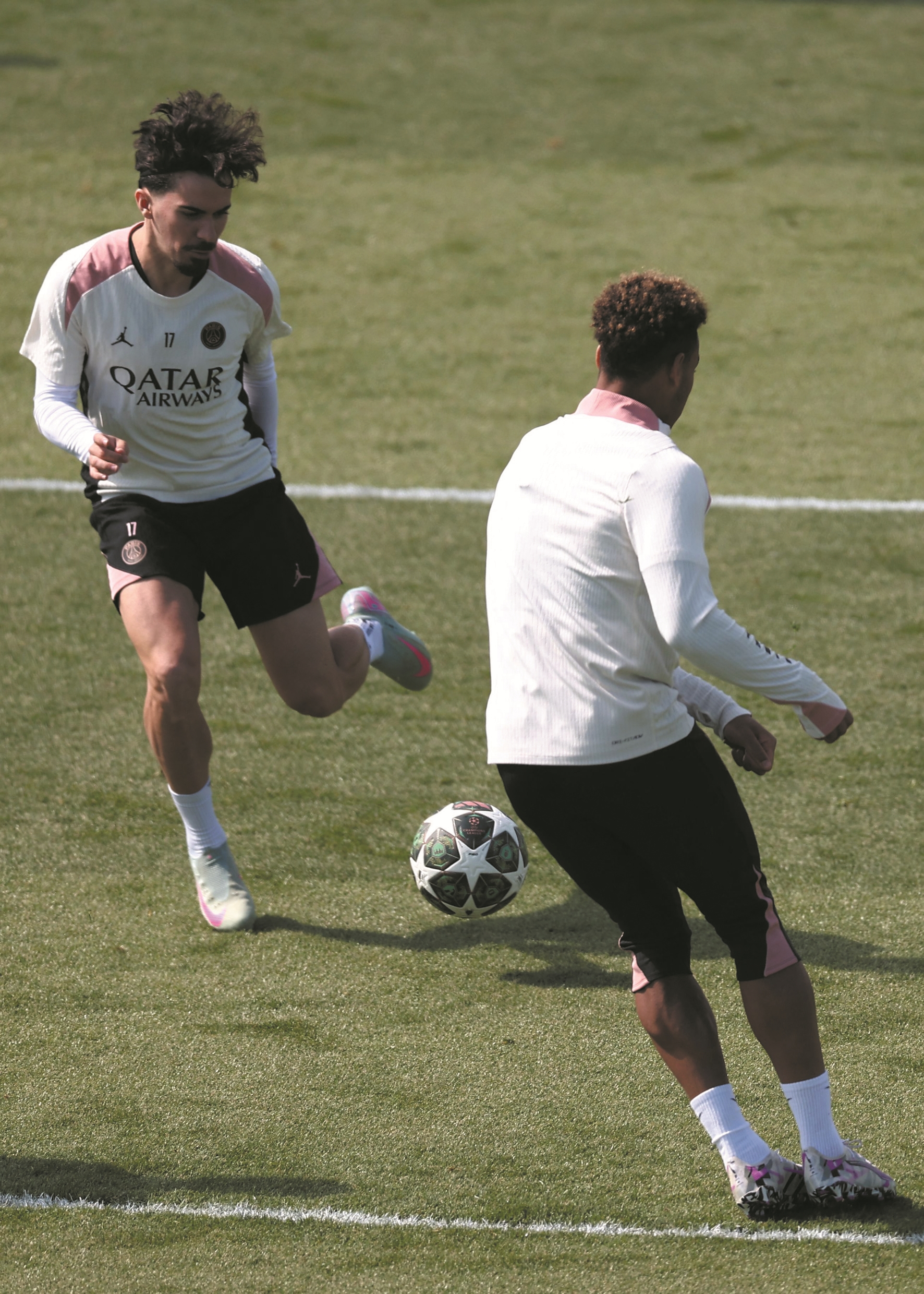 →图为巴黎圣日耳曼队球员维蒂尼亚(左)在训练中。