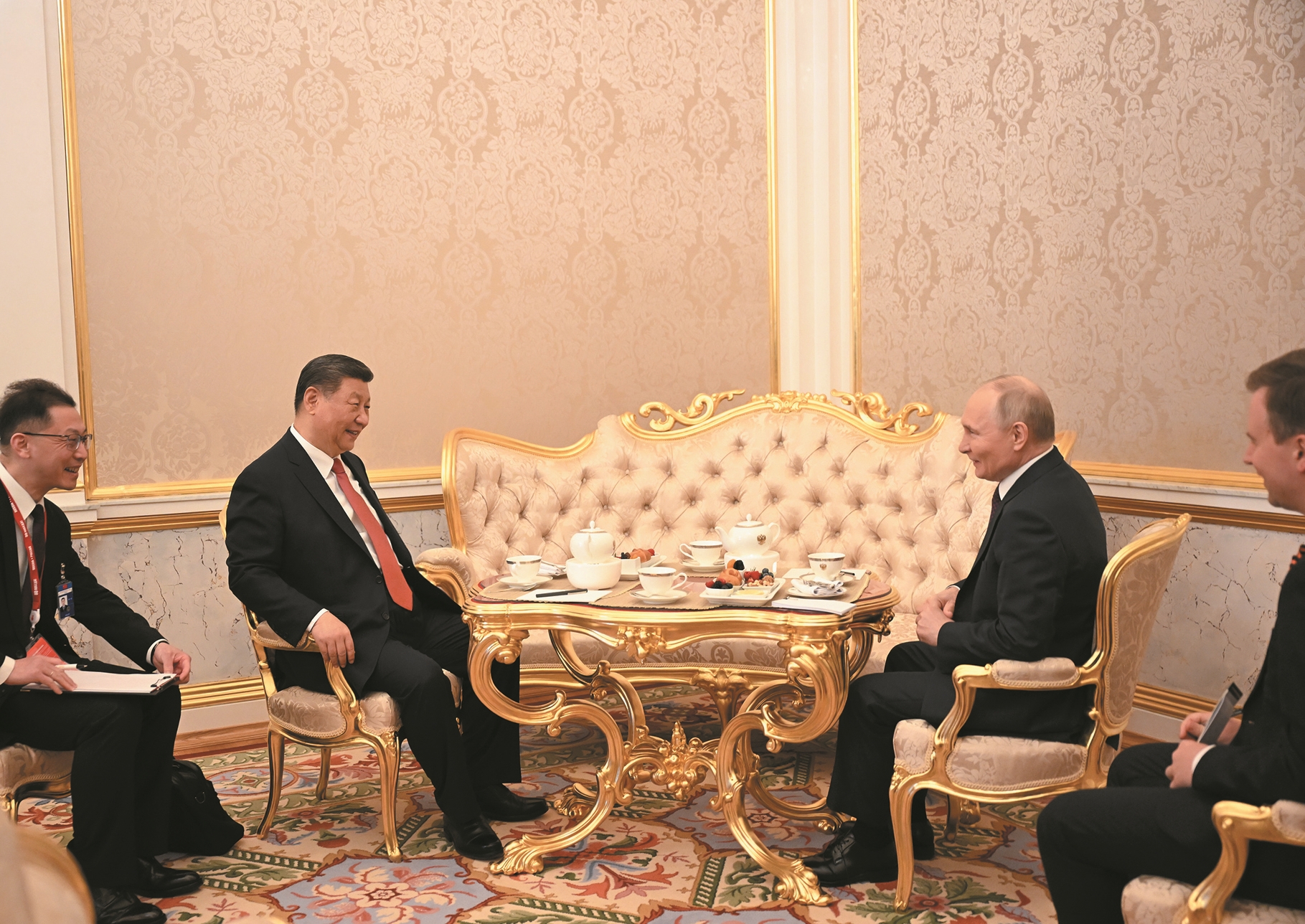 当地时间五月八日下午,俄罗斯总统普京同中国国家主席习近平在莫斯科克里姆林宫总统办公室进行茶叙。 新华社记者 谢环驰摄