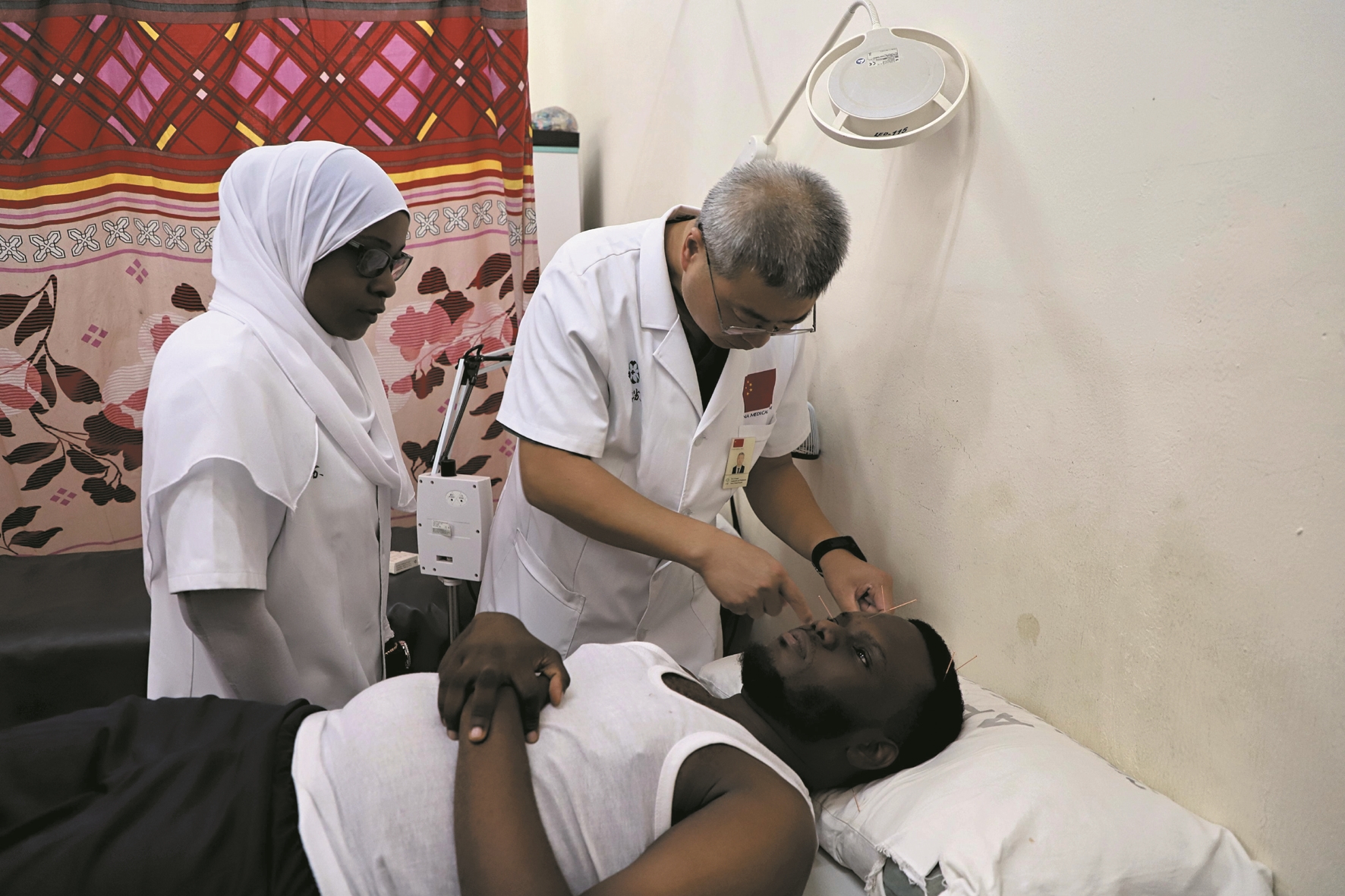 纳兹莫加医院的护士法蒂玛·阿卜杜拉正独立为患者针灸。她是李登科的徒弟。“我从2021年开始学习中医,到现在已经4年了。”她笑着告诉记者,“每一期医疗队的中医专家都是我的老师。针灸、按摩、经络推拿……他们教得很认真,我也很用心地学习,现在已经可以独立使用针灸技术治疗病人了。”