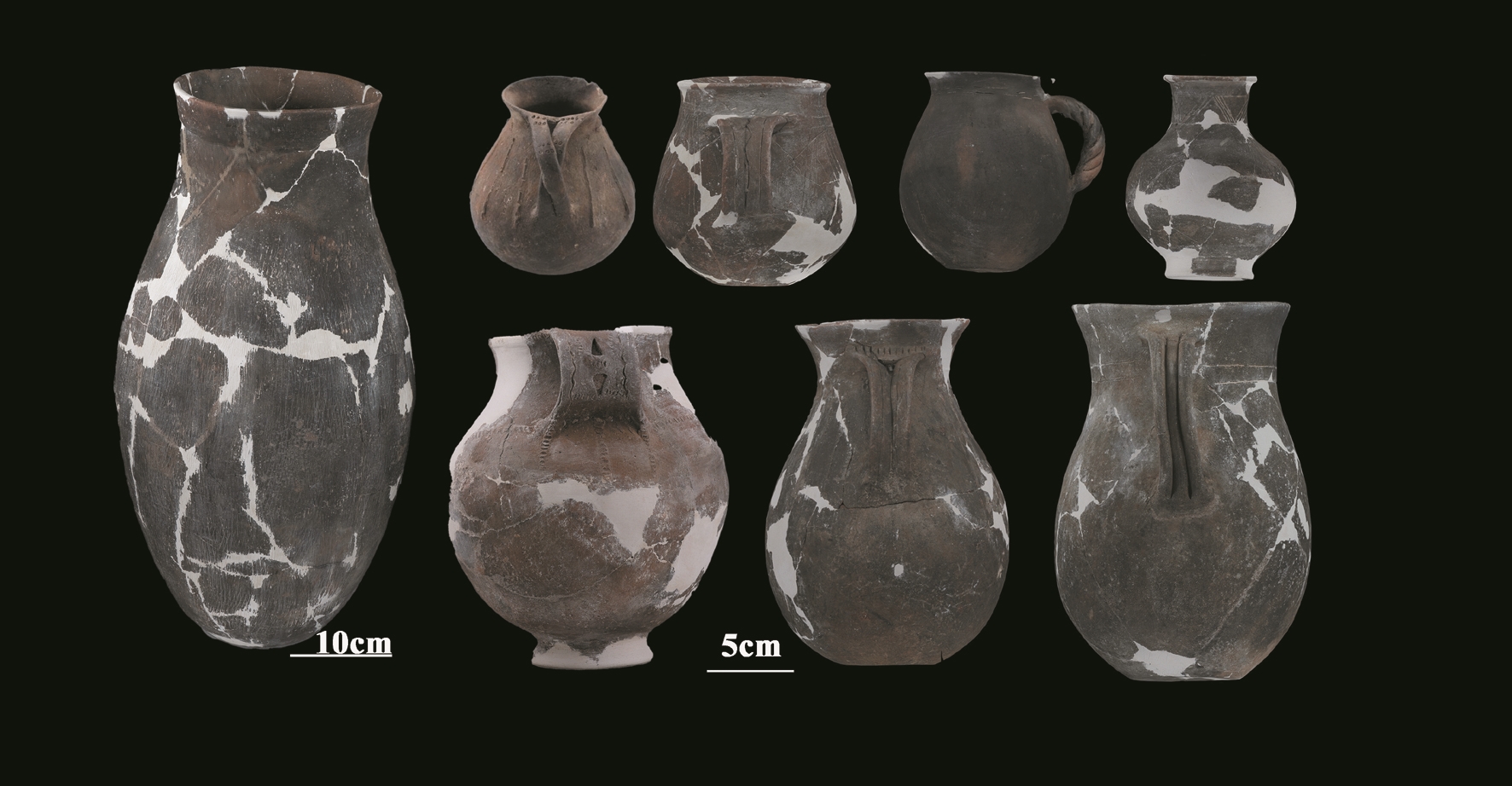 从时间维度来看,第一期出土器物以带有发达印纹与划纹装饰的夹细砂褐陶戳磨光侈口平底罐、折腹平底盆为代表;第二期则以放射线划纹夹云母褐陶单耳平底罐为代表,条形并耳设计应用广泛;到了第三期时,以折沿磨光黑皮陶尖圜底罐为代表,器物延续第二期部分器形,同时呈现小型化趋势;第四期时开始集中出现石网坠。