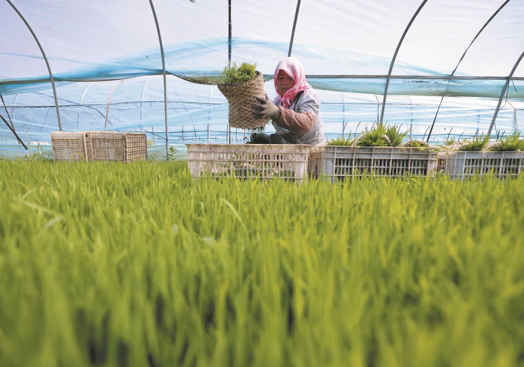 这是5月13日,河北省唐山市丰南区岔河镇一水稻种植合作社的社员在水稻育苗棚内起秧苗。