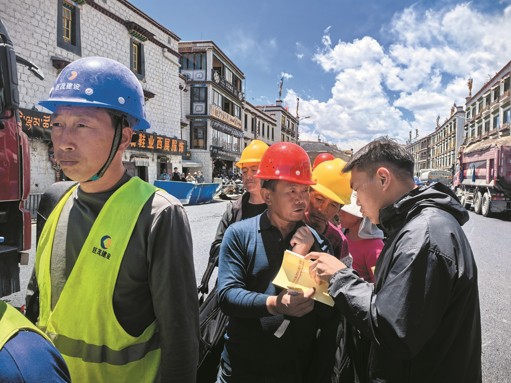 图为市总工会工作人员向施工人员发放《拉萨市民族团结进步条例》手册。 拉萨融媒记者 小拉姆次仁摄