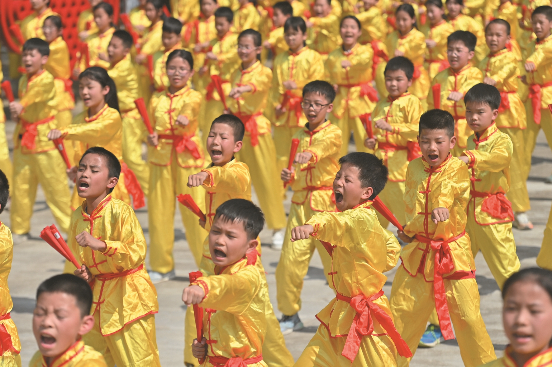 这是5月13日,学生在蒙山县文圩镇文圩中心小学练习功夫扇。