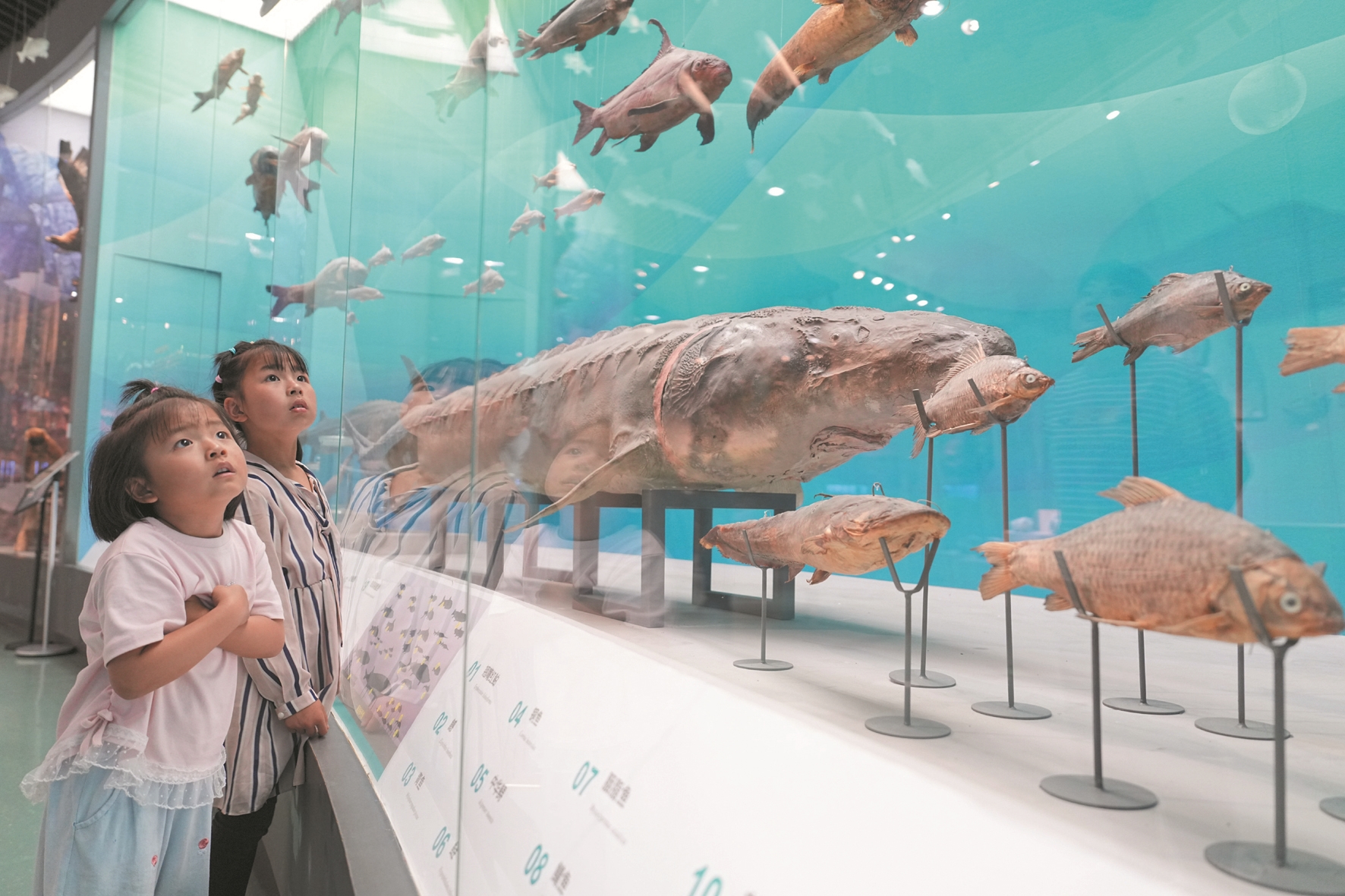 图②为5月17日,两名小女孩在重庆自然博物馆重庆厅参观。