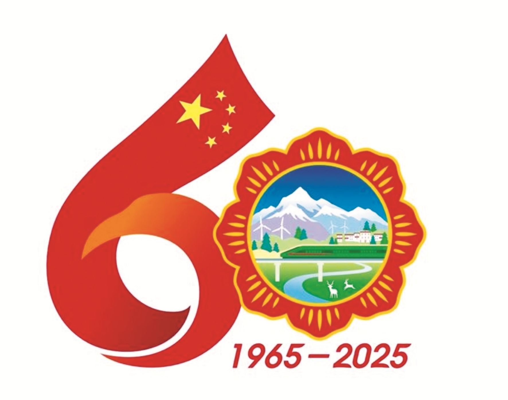 西藏自治区成立60周年庆祝活动徽标是由五星红旗延展出的飘带与格桑花瓣环构成的数字“60”造型。飘扬的五星红旗象征着繁荣昌盛的祖国母亲对西藏的关怀与呵护,使西藏在砥砺奋进的60年中绽放出灿烂的格桑花朵。西藏复兴号、现代化新农村、风力发电、雪山、藏羚羊等代表了60年来西藏社会主义现代化建设取得的丰硕成果。“1965-2025”代表西藏自治区成立60周年。标识兼具中华民族精神与西藏历史底蕴,整体色彩使用了国旗红,营造出喜庆、热烈、祥和的氛围。