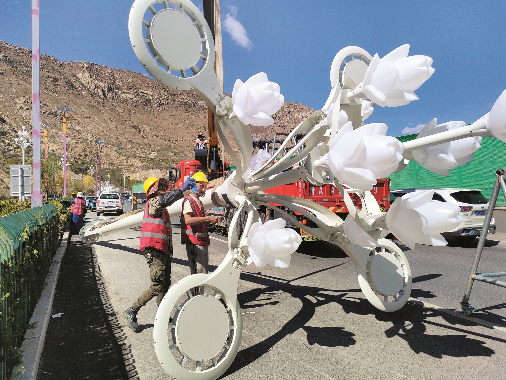 图为工人师傅们正在有序进行灯杆组装、穿电缆、接线等工作。 拉萨融媒记者 李从芳摄