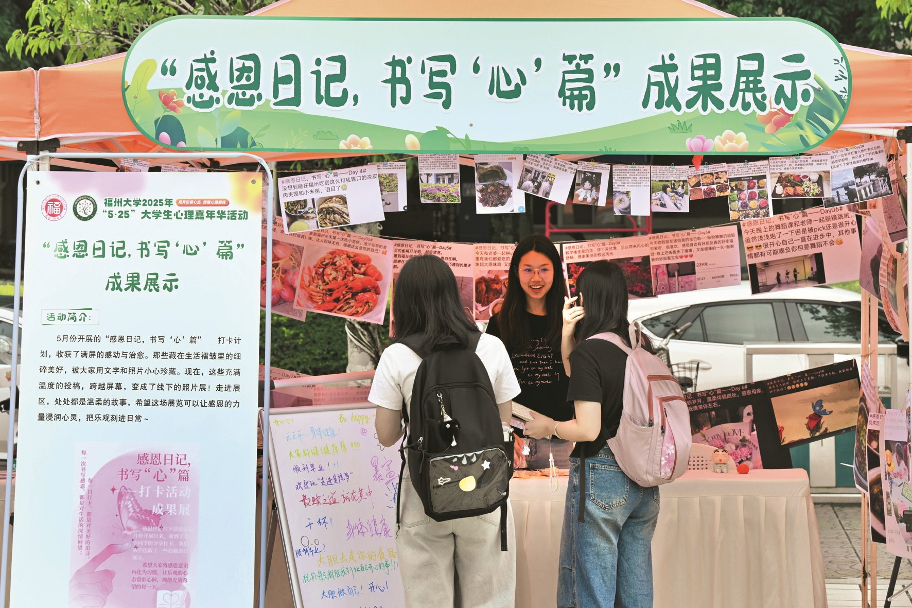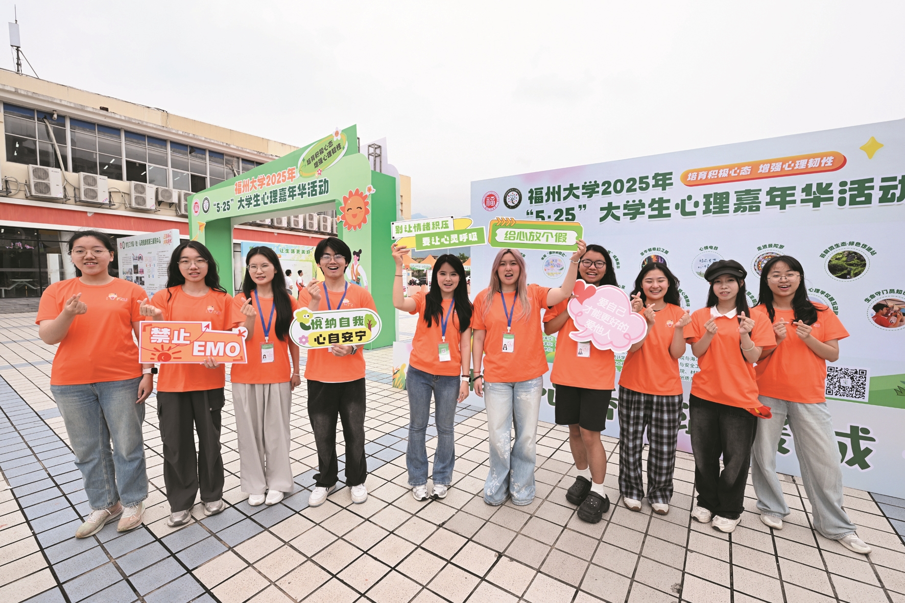 图③为福州大学“小福心”心理健康服务社团成员展示心理健康宣传标牌。