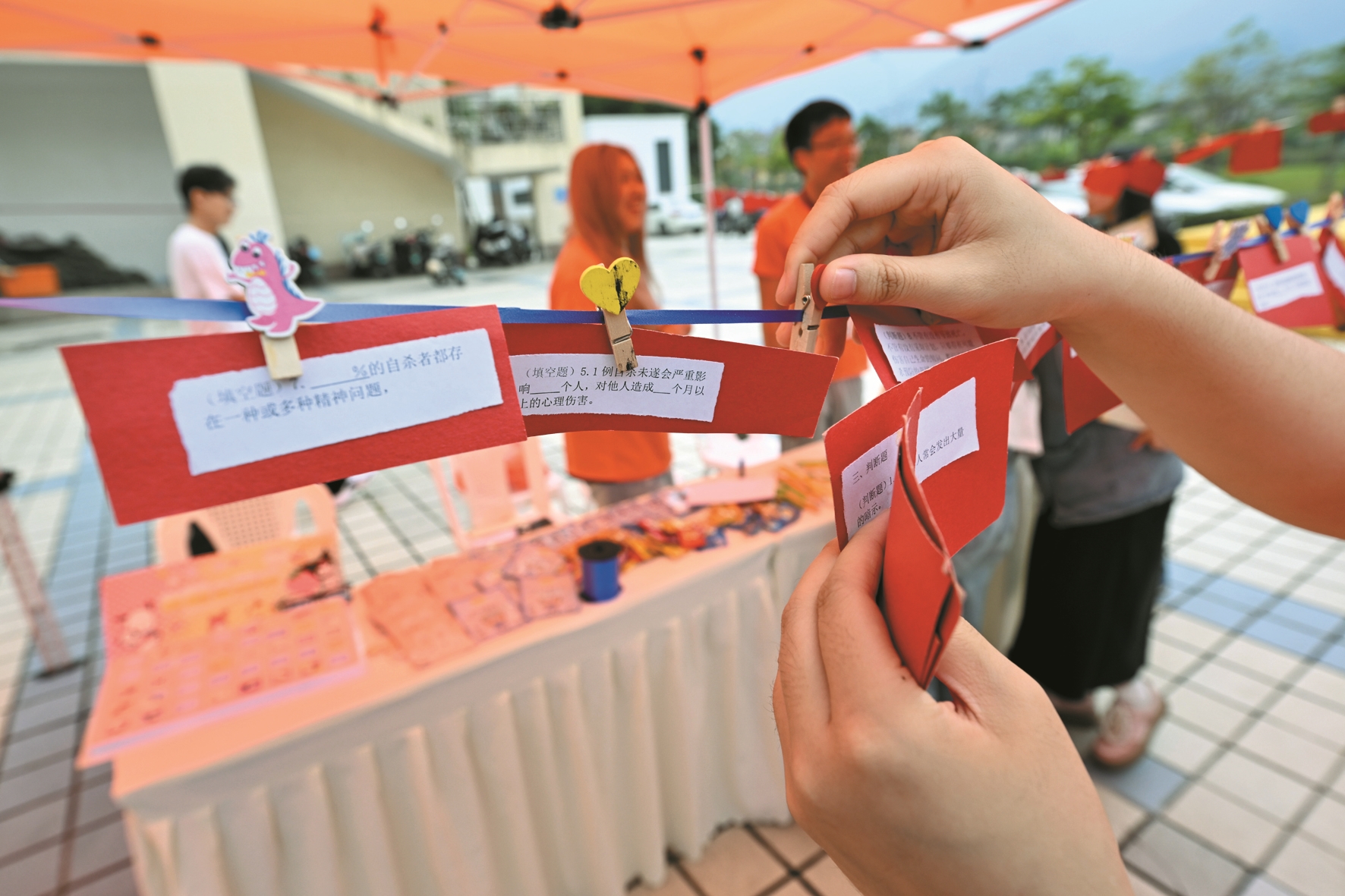 图①为福州大学心理嘉年华活动上,一名同学在悬挂心理健康知识问答题卡。