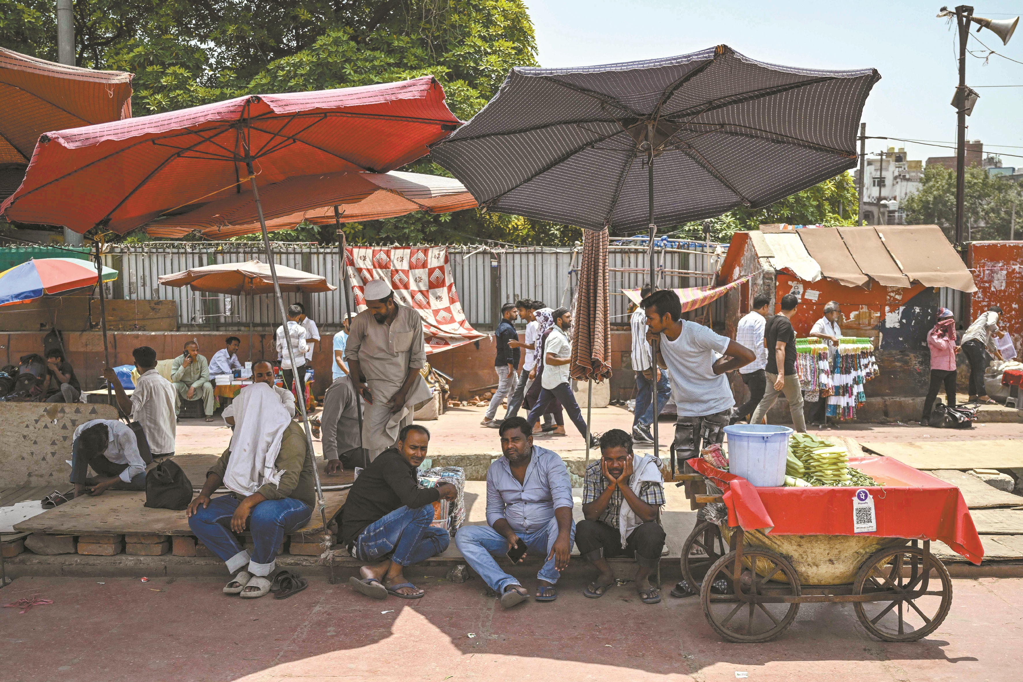 图为5月16日,在印度德里老城区,人们在伞下纳凉。