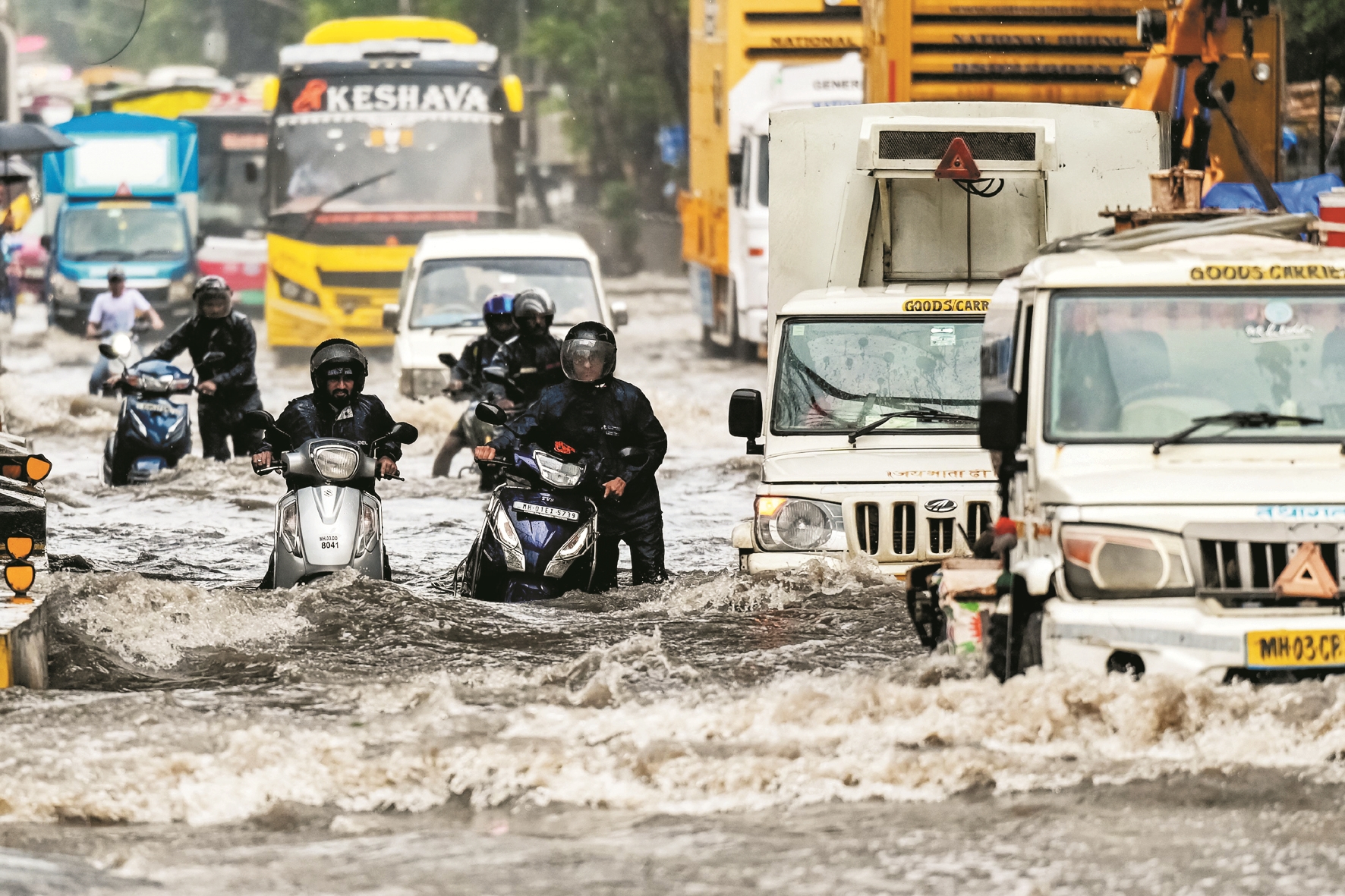 图为5月26日,车辆和通勤者在印度孟买暴雨后积水的马路上行进。