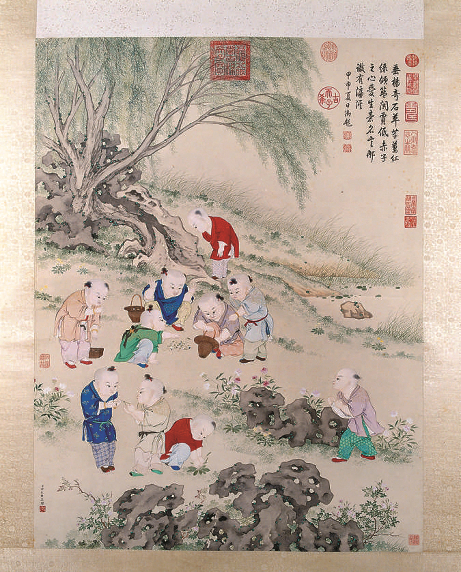 如果上述斗草游戏算“文斗”的话,那孩子们的斗草,则是另一种玩法,就是我们小时候玩的“拔根儿”,可以算作斗草中的“武斗”。清代金廷标的《儿童斗草图》,就画了十个孩子斗草的情景。其中的两个孩子正努着嘴、瞪着眼,把草茎交叉在一起,两手握紧自己的草用力拉扯呢。一声“开始”,两人同时用力,看谁的草先断,这一点小小的胜利,也会让得胜的孩子欢呼雀跃。