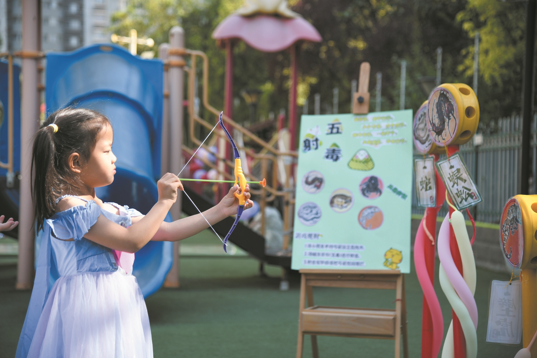 图为当日,在陕西省西安市明园幼儿园,小朋友体验“射五毒”游戏。