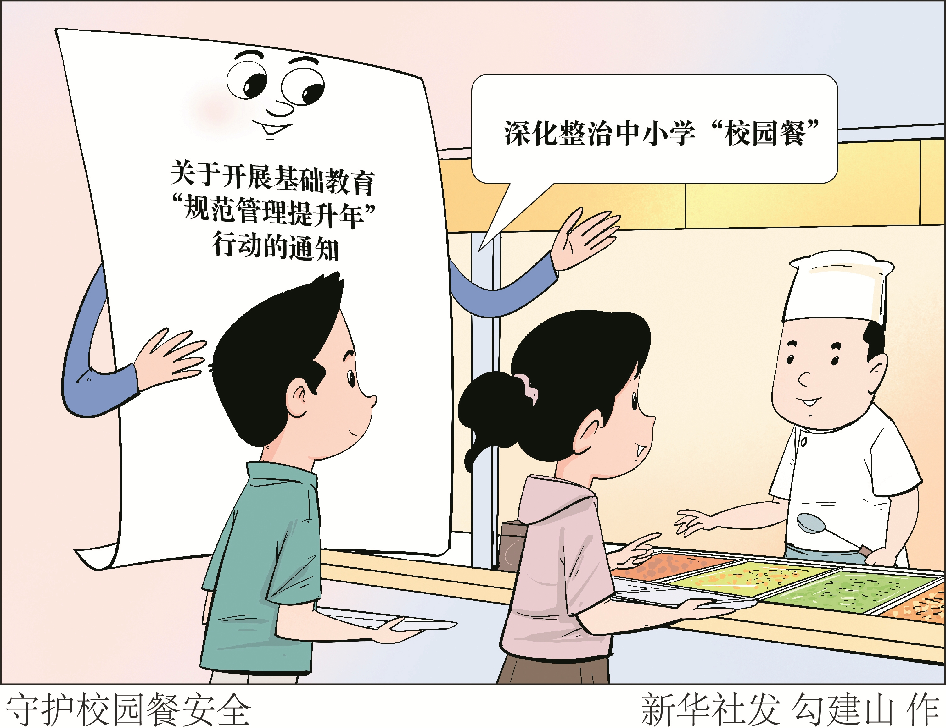 近日,教育部办公厅印发《关于开展基础教育“规范管理提升年”行动的通知》,提出深化整治中小学“校园餐”。校园餐的安全是社会普遍关切,让校园餐干净卫生、营养健康,让每一分钱都吃到学生嘴里也是各地一直努力的目标。但食堂绞肉机内发现蛆虫、“鼠头鸭脖”等事件也反映出校园餐仍存在漏洞,必须给予深入且常态化治理。(新华社发)