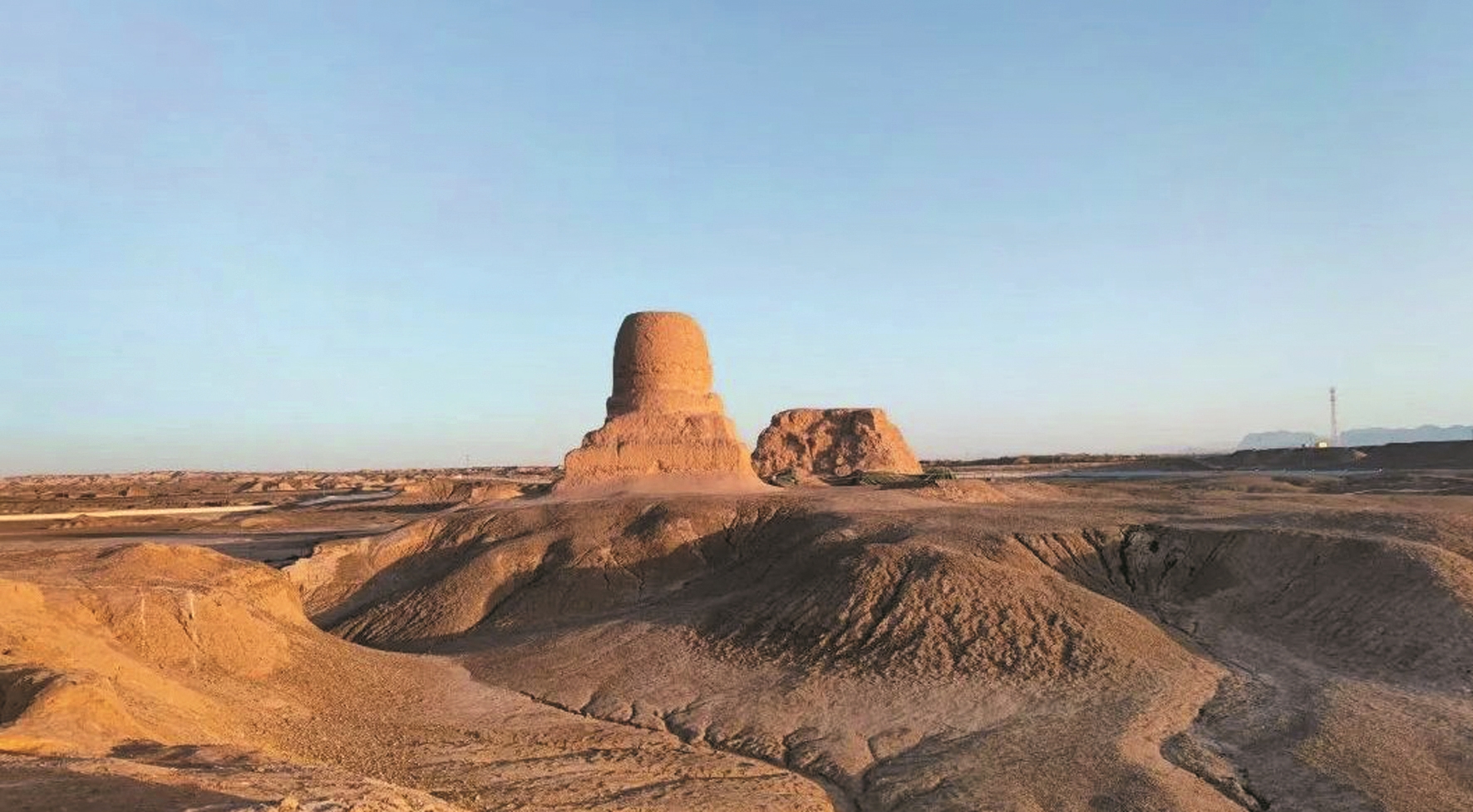 肖小勇介绍,莫尔佛塔(圆塔)是高覆钵式土坯塔,采用犍陀罗传统的窣堵波样式,作为莫尔寺遗址的标志性建筑,已经屹立了1800余年。相隔约60米,由5层塔身和大型台基构成的方形实心土坯塔(方塔),台基边长39.36米,仅比位于河北的、东魏北齐时期邺城赵彭城佛寺遗址的佛塔台基边长小5米,规模接近皇家寺院等级。