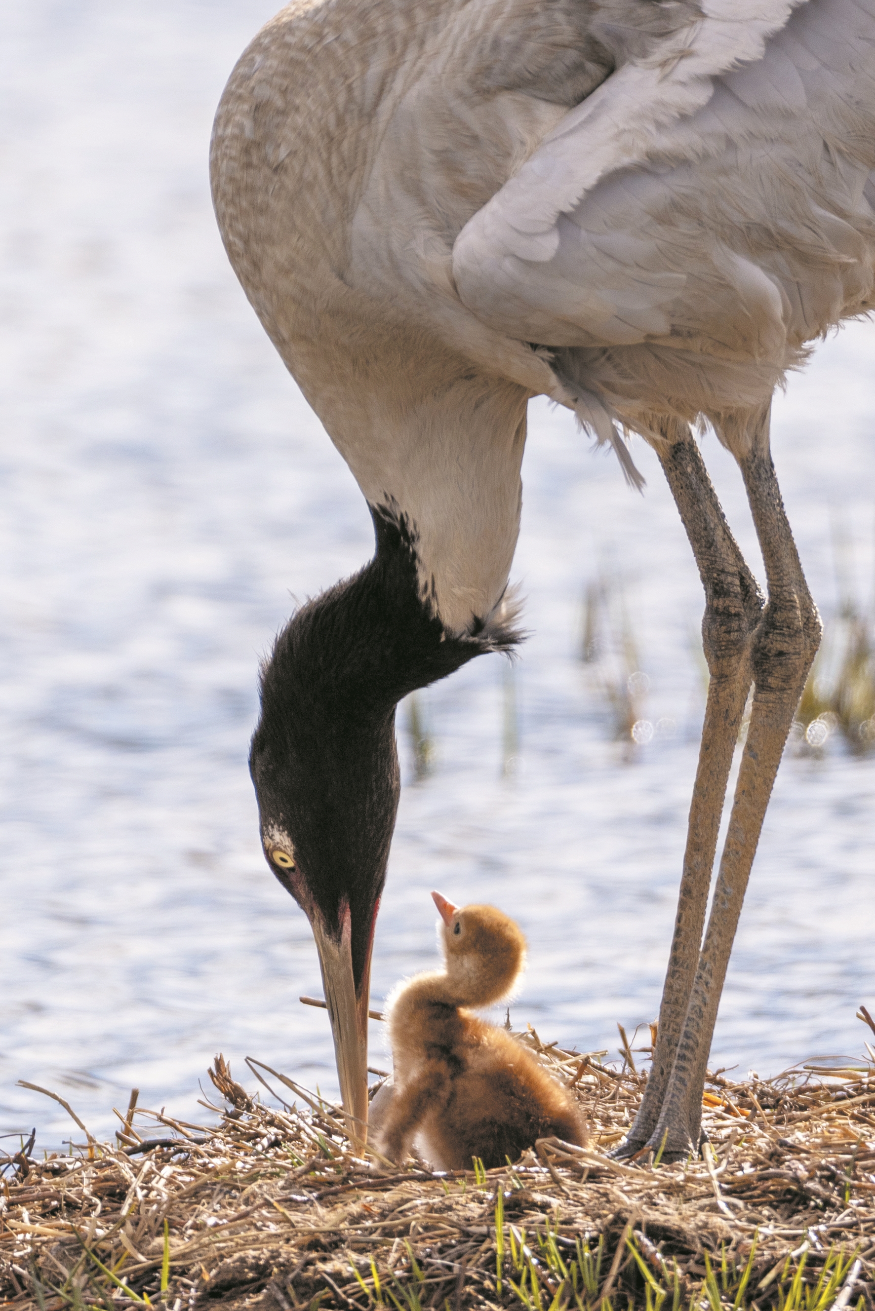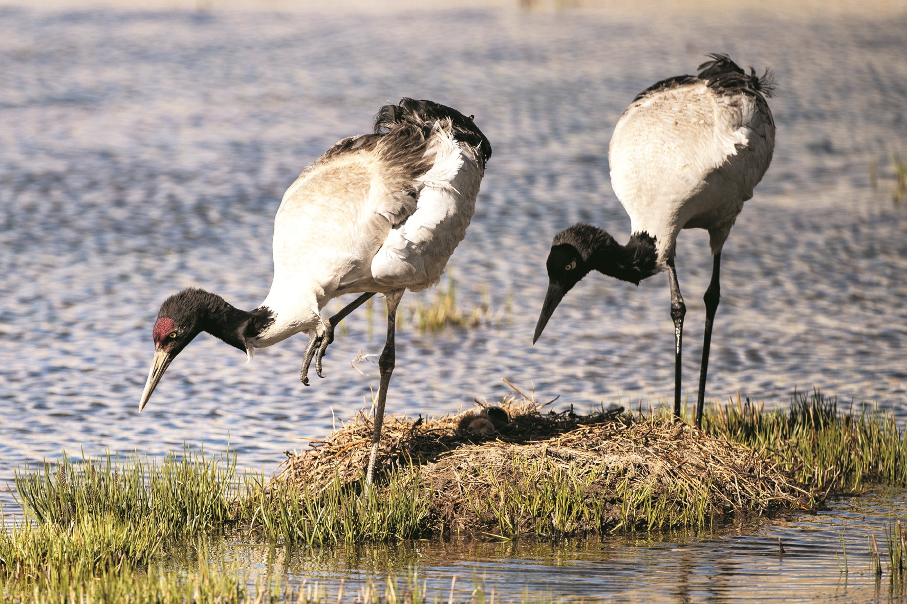 ?这是6月5日,一只黑颈鹤在那曲市申扎县的湿地上照顾前一天刚出壳的雏鸟。