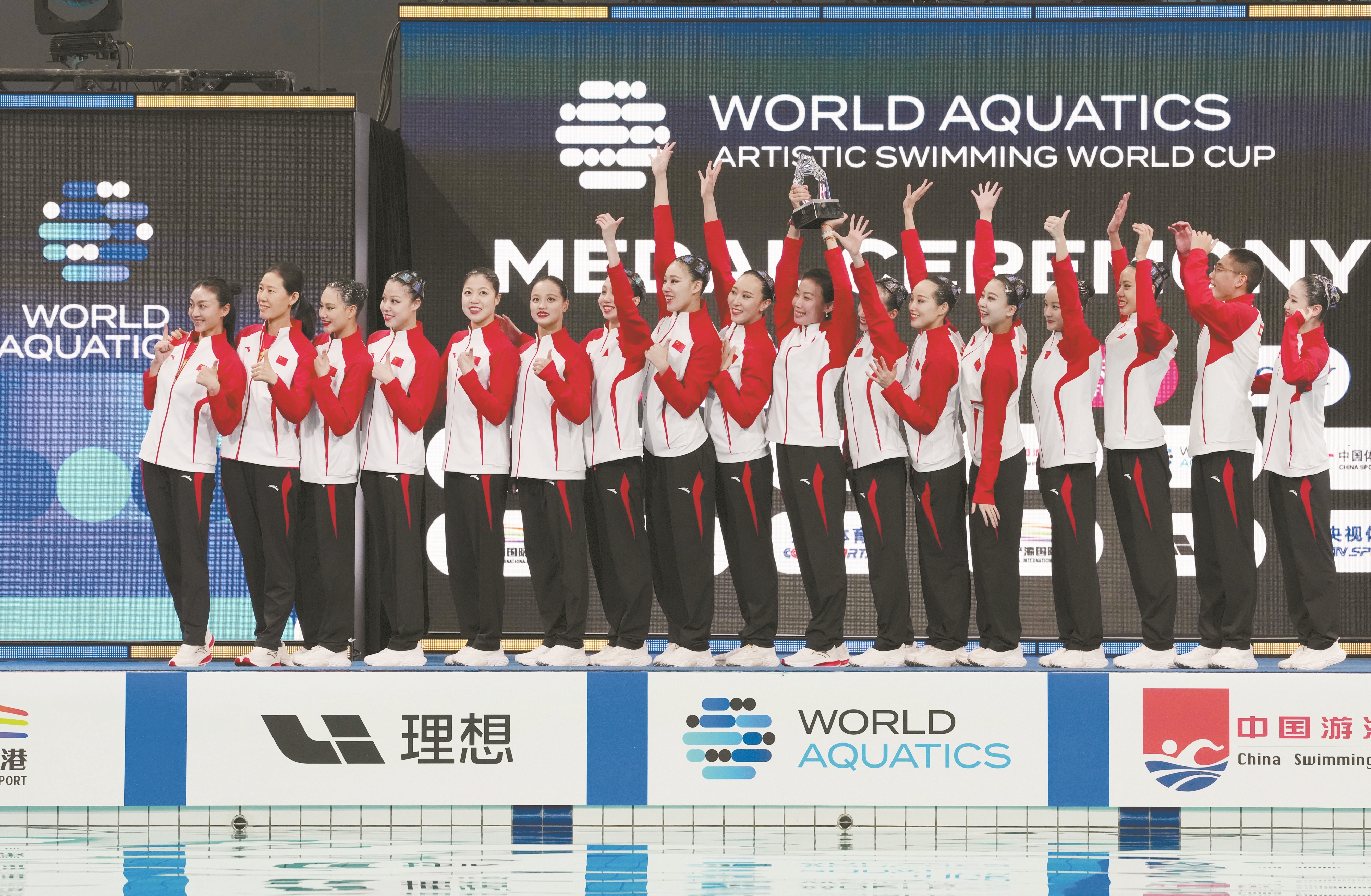 图为6月15日,中国队在2025年花样游泳世界杯总决赛团体总冠军颁奖仪式上。 新华社记者 李一博摄