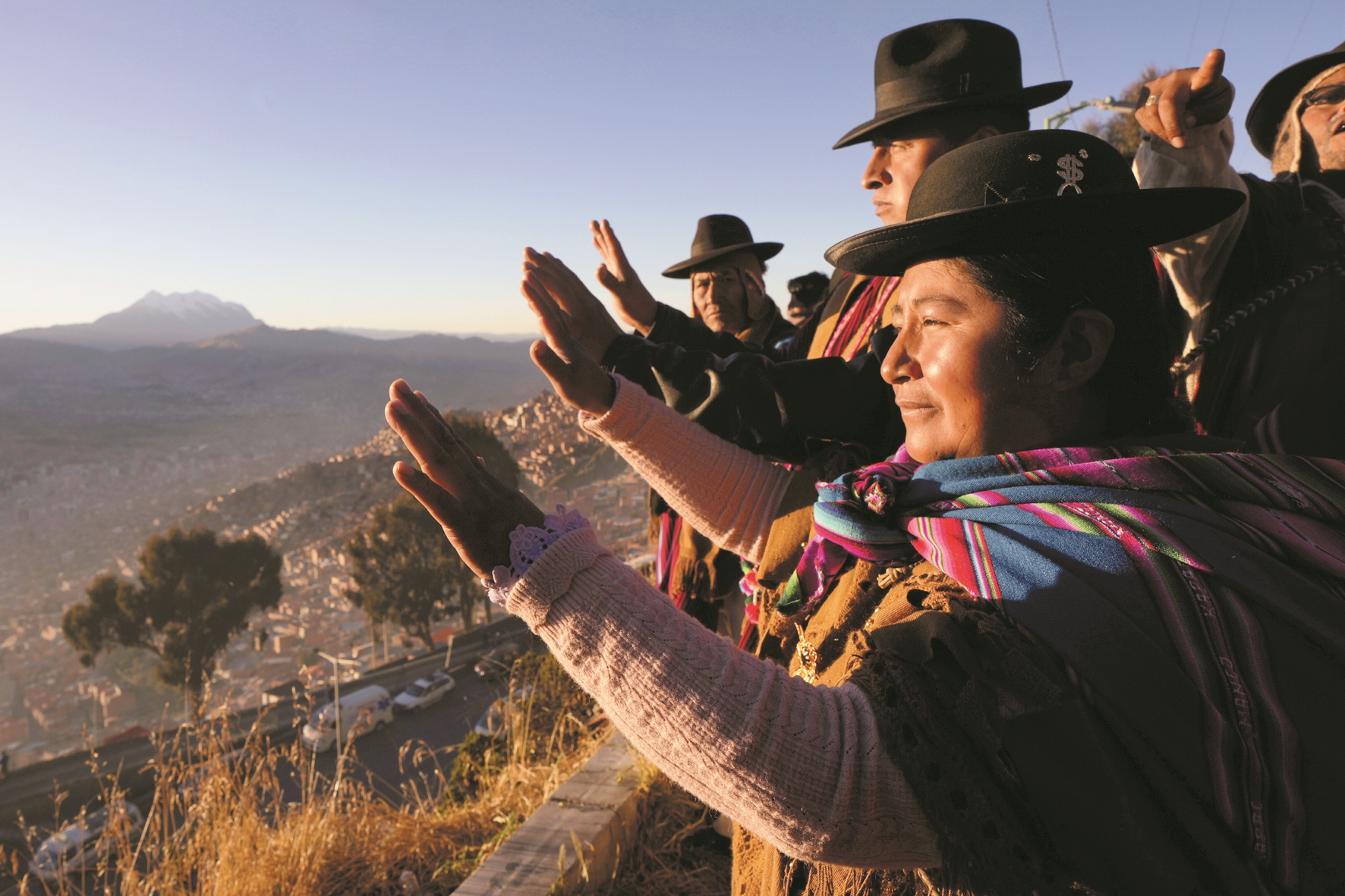 这是在玻利维亚埃尔阿尔托,人们在迎接安第斯新年的传统仪式上举起双手“触摸”新年第一缕阳光。