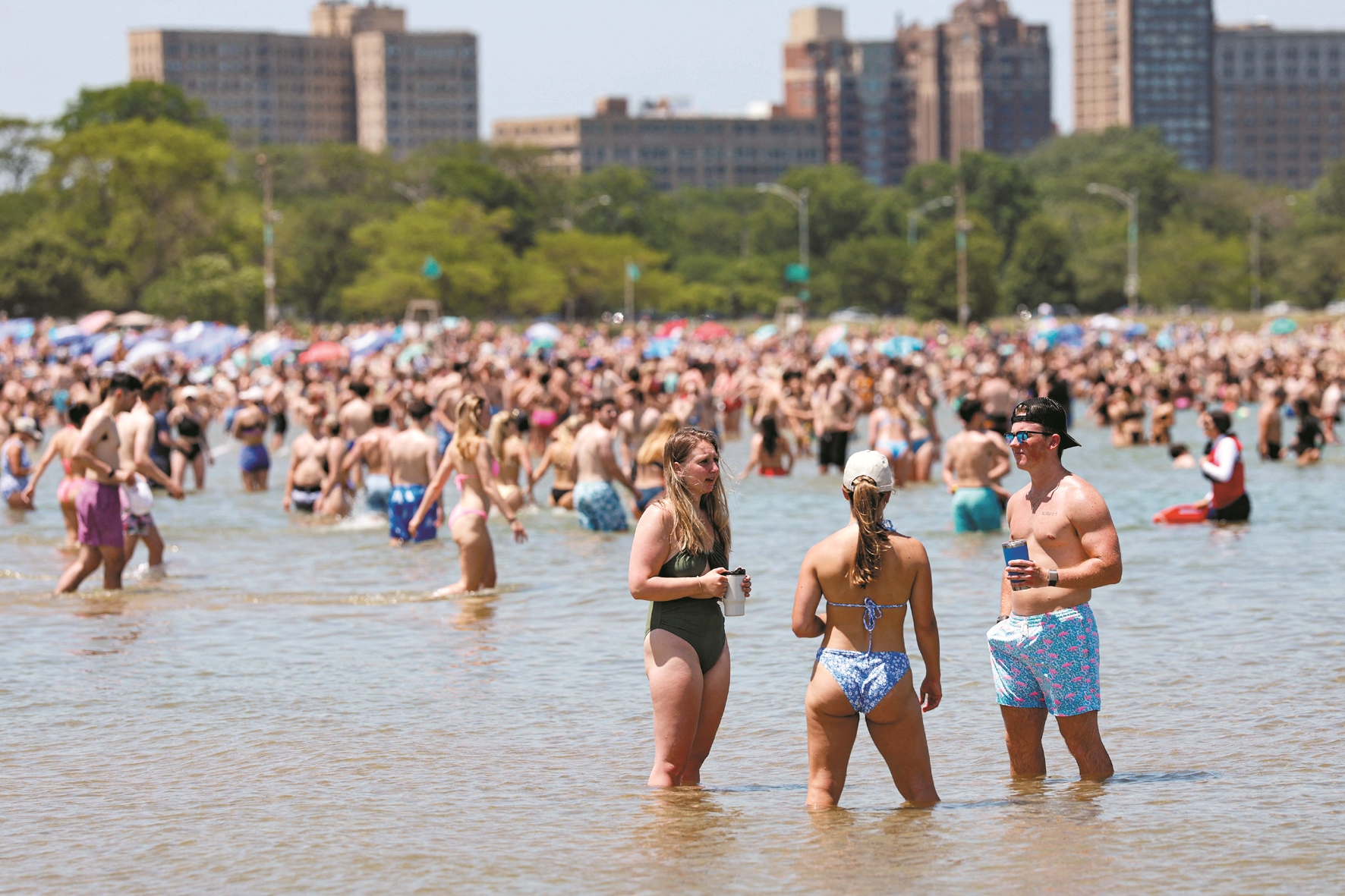 这是6月21日,在美国芝加哥,人们在密歇根湖中消暑。