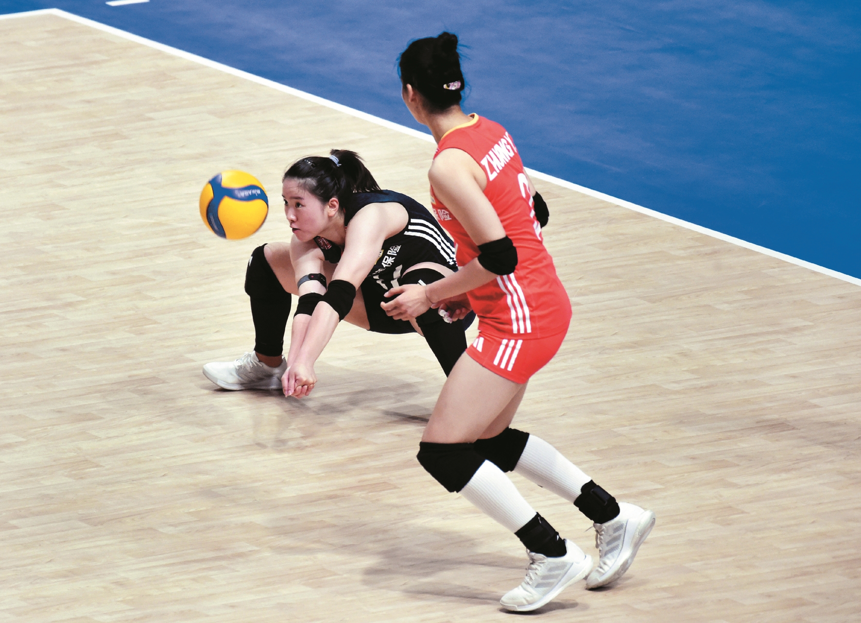 图为6月21日,中国队球员倪非凡(左)在比赛中垫球。 (新华社发)
