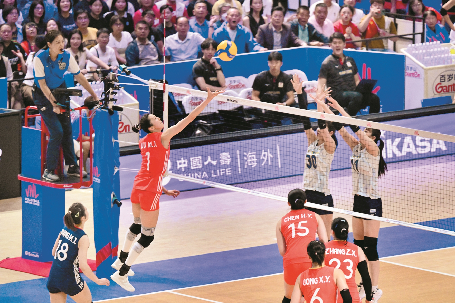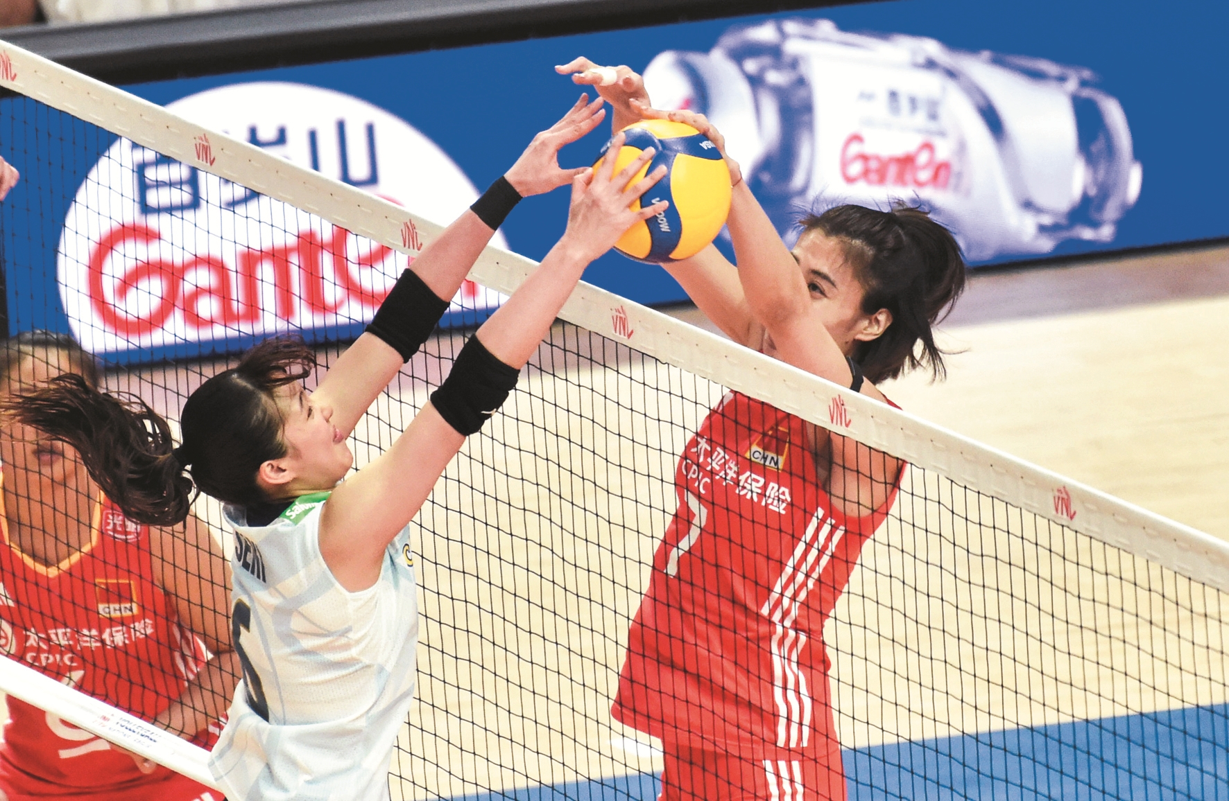 6月21日,在2025世界女排联赛(中国香港站)比赛中,中国队3比1战胜日本队。 当日,中国队球员王媛媛(右)在比赛中拦网。 (新华社发)