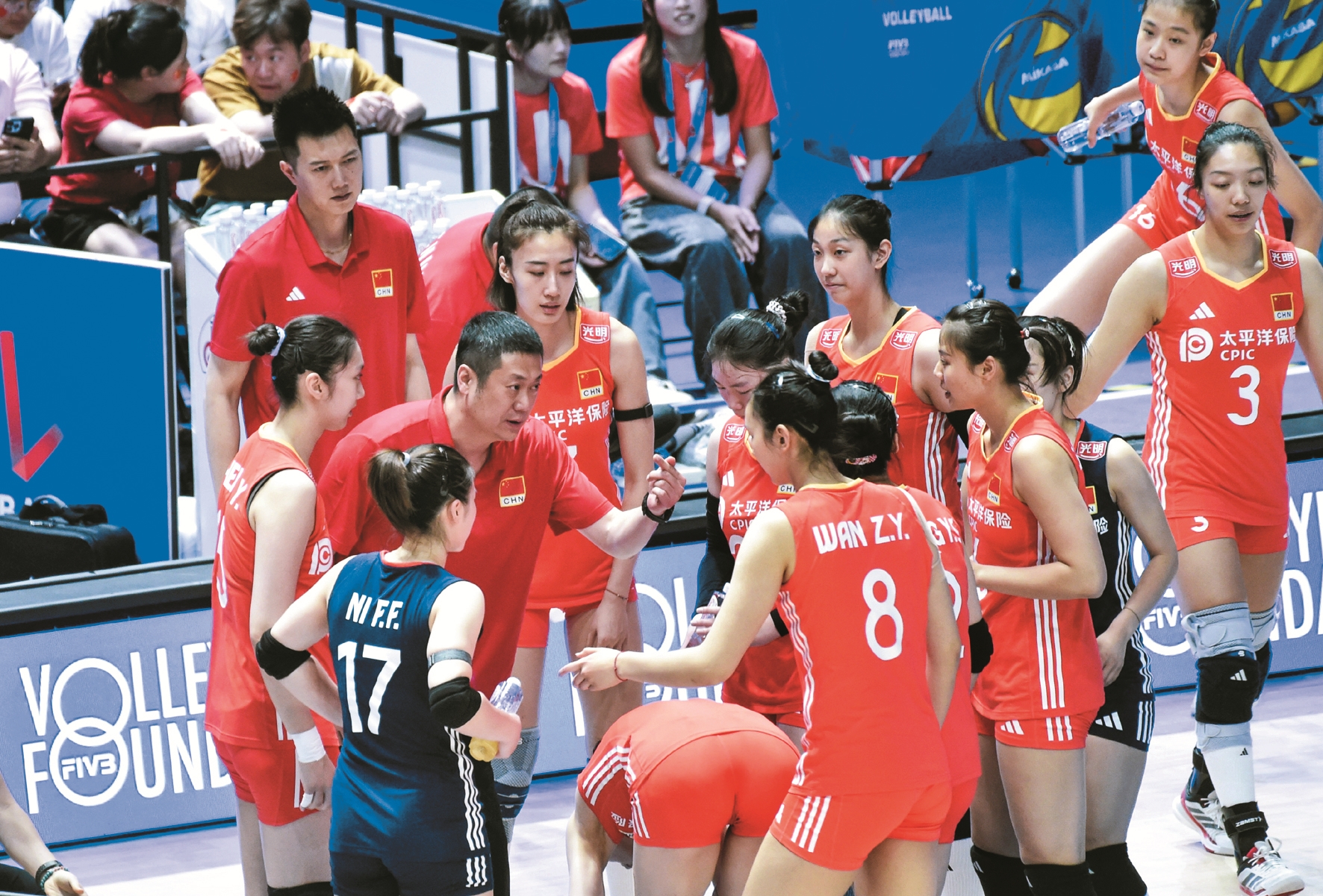 图为6月21日,中国队主教练赵勇(中左二)在比赛休息时指导球员。(新华社发)