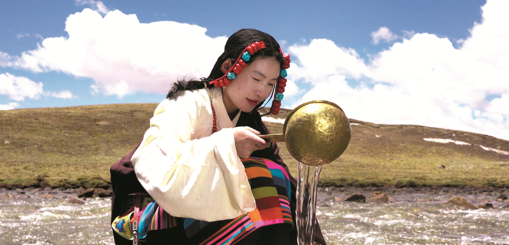 晨光刺破念青唐古拉山的雪线时,一位藏族姑娘已经背着铜壶走向澎措湖畔。她俯身将赭红色的藏袍轻轻掖在脚边,铜壶置于身侧,手持铜勺舀起满满清泉,倒入壶中;三五次过后,水壶已满。河水潺潺,她清瘦的背影在山谷中慢慢走远……