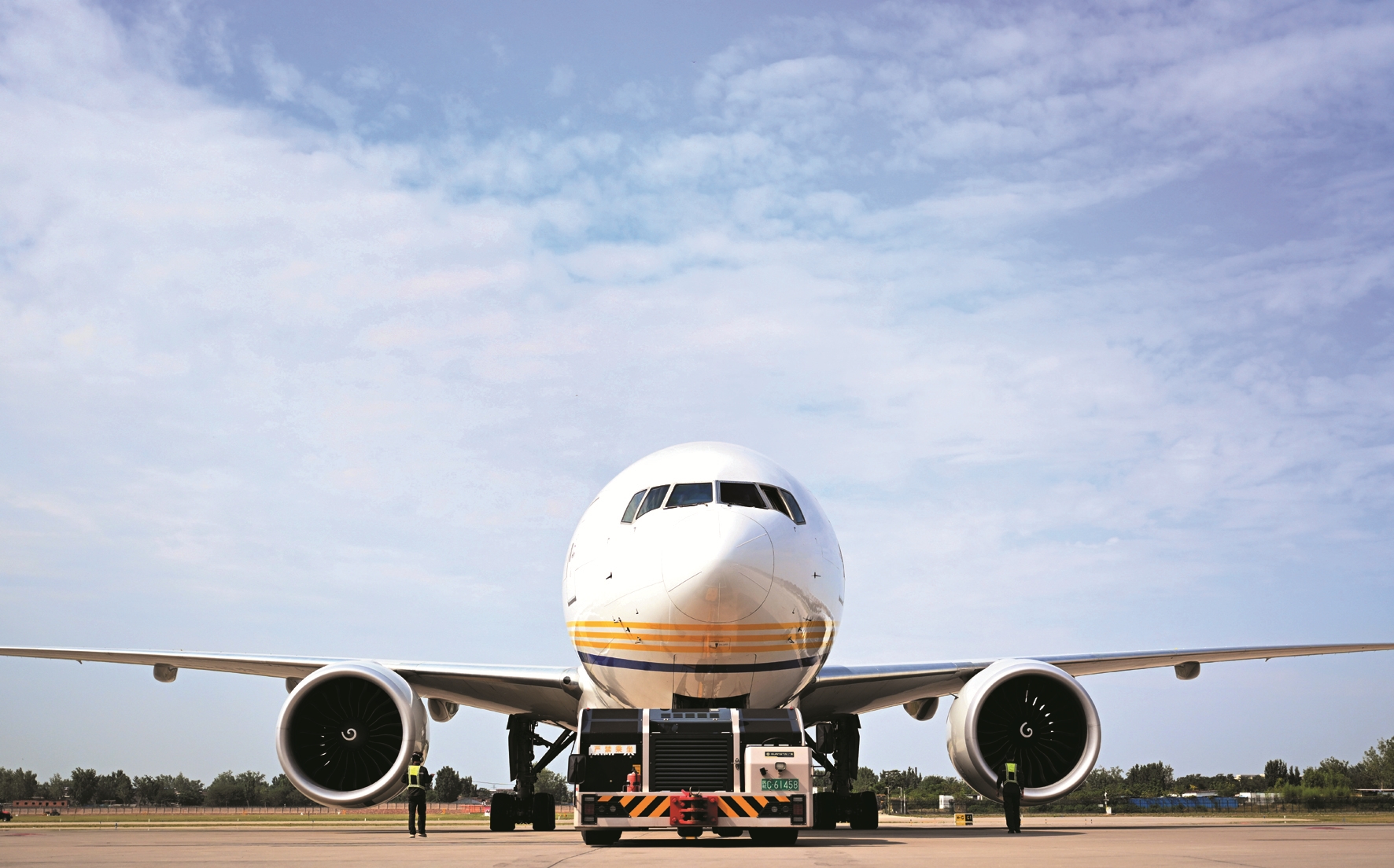 图为中国邮政郑州至卢森堡国际货运航线首航货机在郑州新郑国际机场做起飞前的准备。