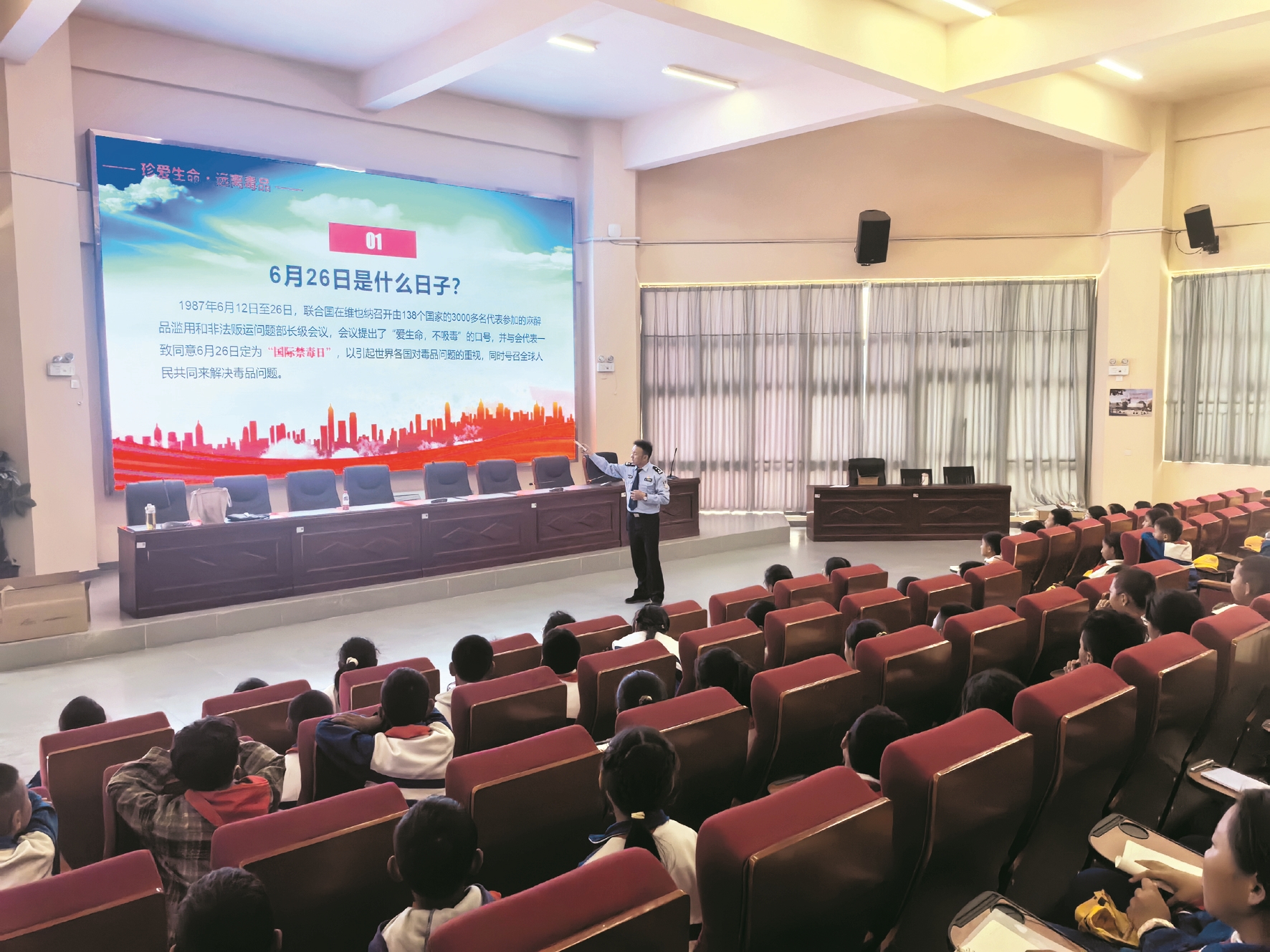 活动现场,法治副校长、羊达街道派出所副所长陈春银以真实案例为切入点,通过图文展板与视频资料,向学生系统讲解传统毒品与新型毒品的种类特征、成瘾机制及对个人健康、家庭关系、社会秩序的破坏性影响。