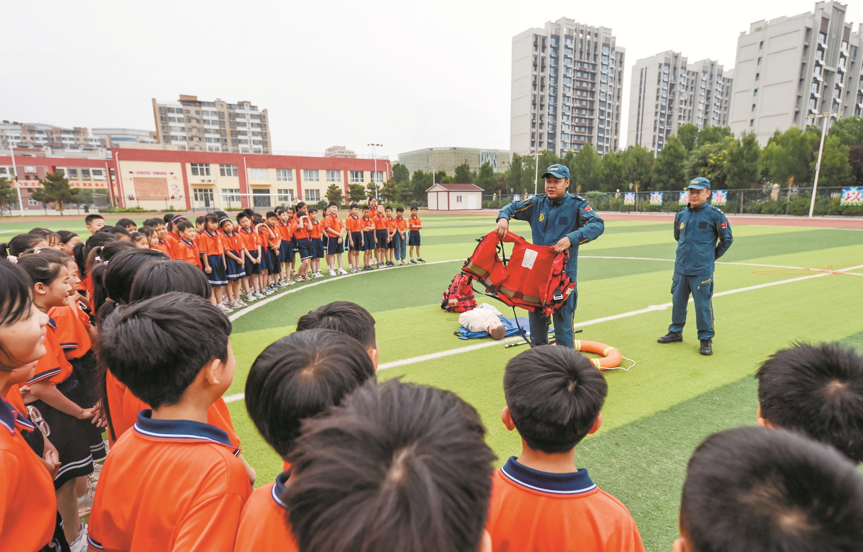 暑假临近,河北省邯郸市邱县第二中学附属小学开展安全教育活动,学生在蓝天救援队的指导下学习防溺水常识、演练急救技能,提高安全意识和自救能力。
