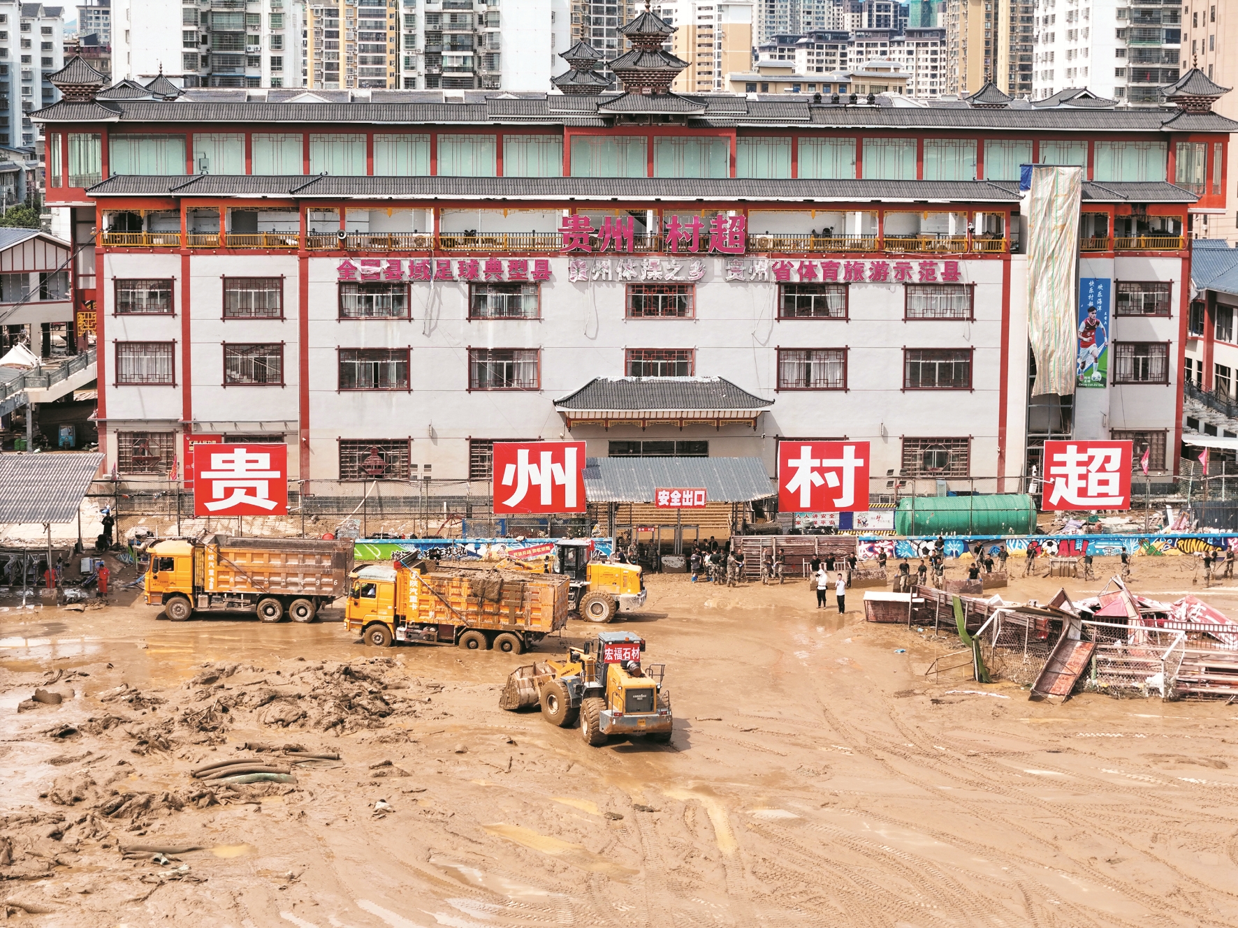 图为6月25日,大型设备在贵州省榕江县“村超”球场进行清淤(无人机照片)。 (新华社发)