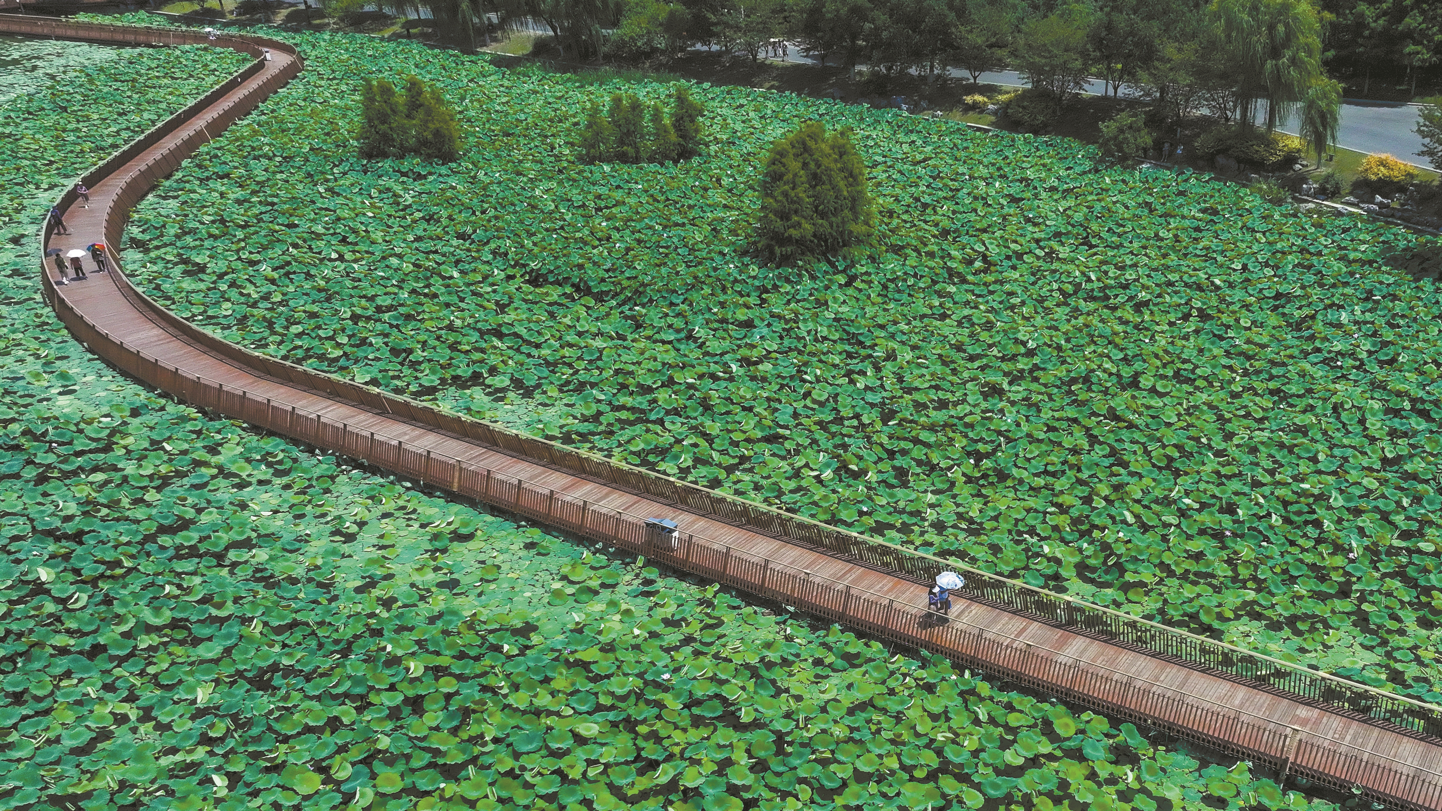 夏日时节,南京玄武湖公园内的荷叶渐密,赏荷栈道隐匿其中,宛如一条通往梦幻仙境的小径,吸引众多市民游客前来漫步休闲,临水赏荷。