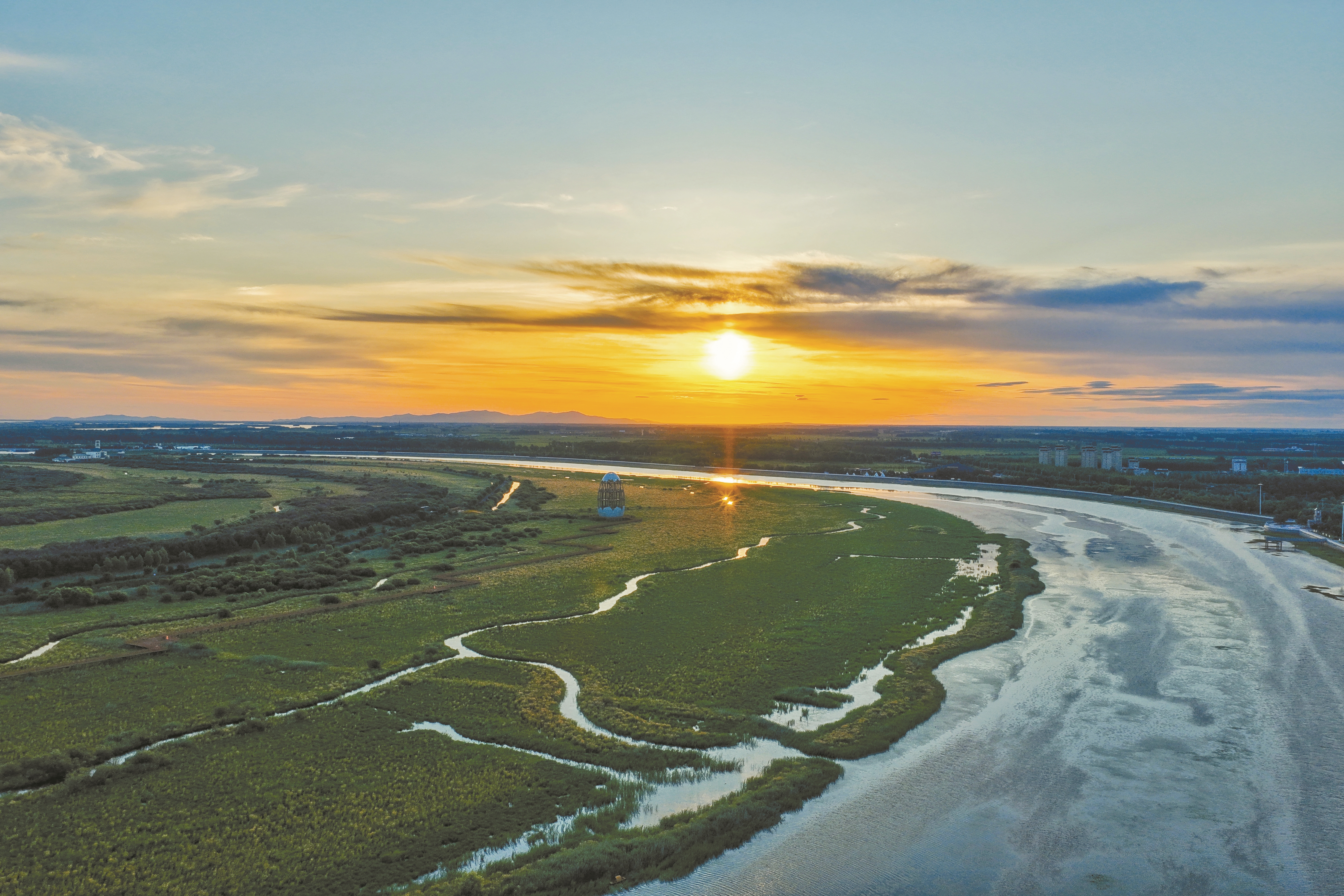 图③为7月4日在黑龙江省佳木斯市同江市三江口国家湿地公园拍摄的年度“最小太阳”(无人机照片)。 (新华社发)