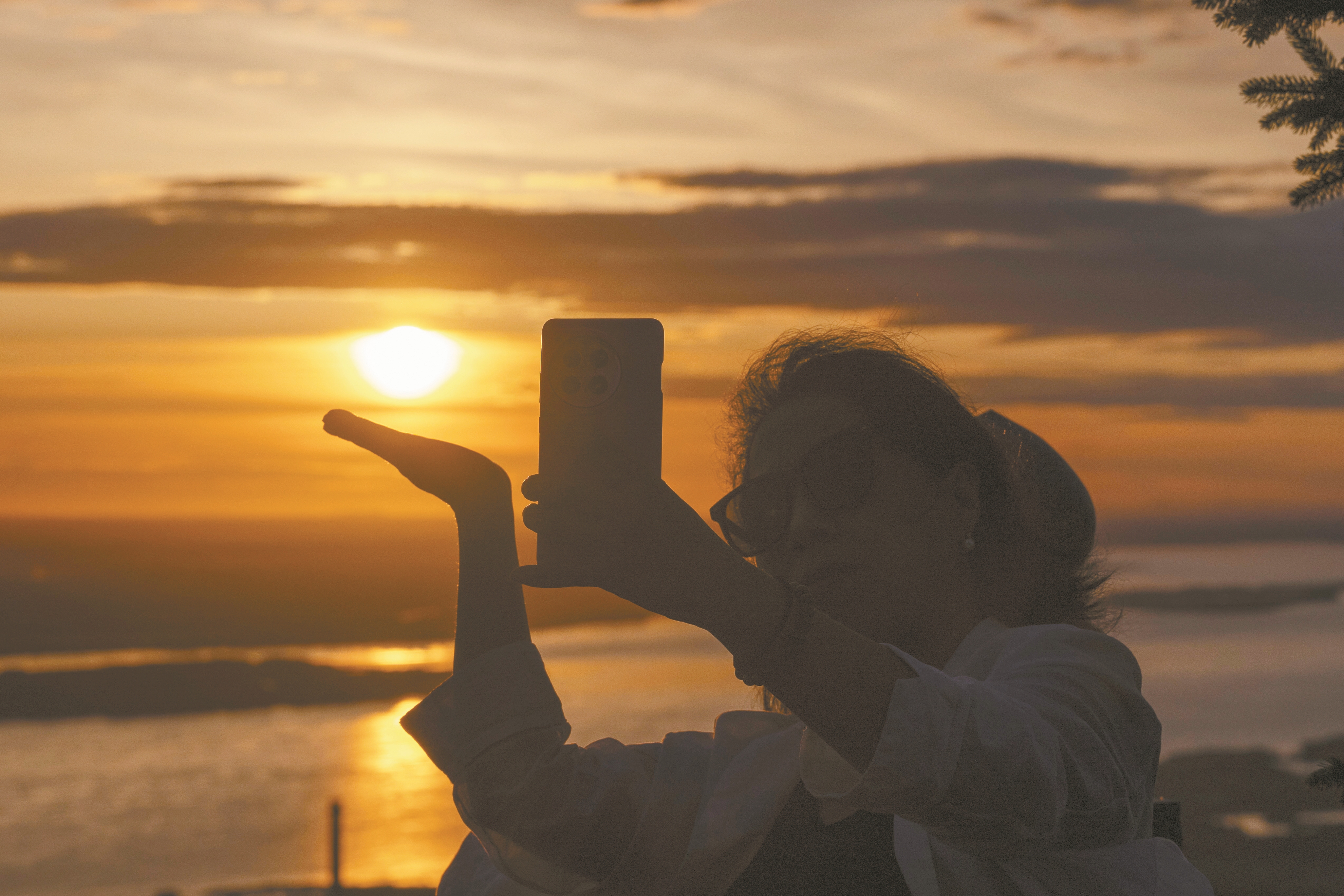 图②为7月4日,游客在黑龙江抚远市东极阁拍摄年度“最小太阳”。