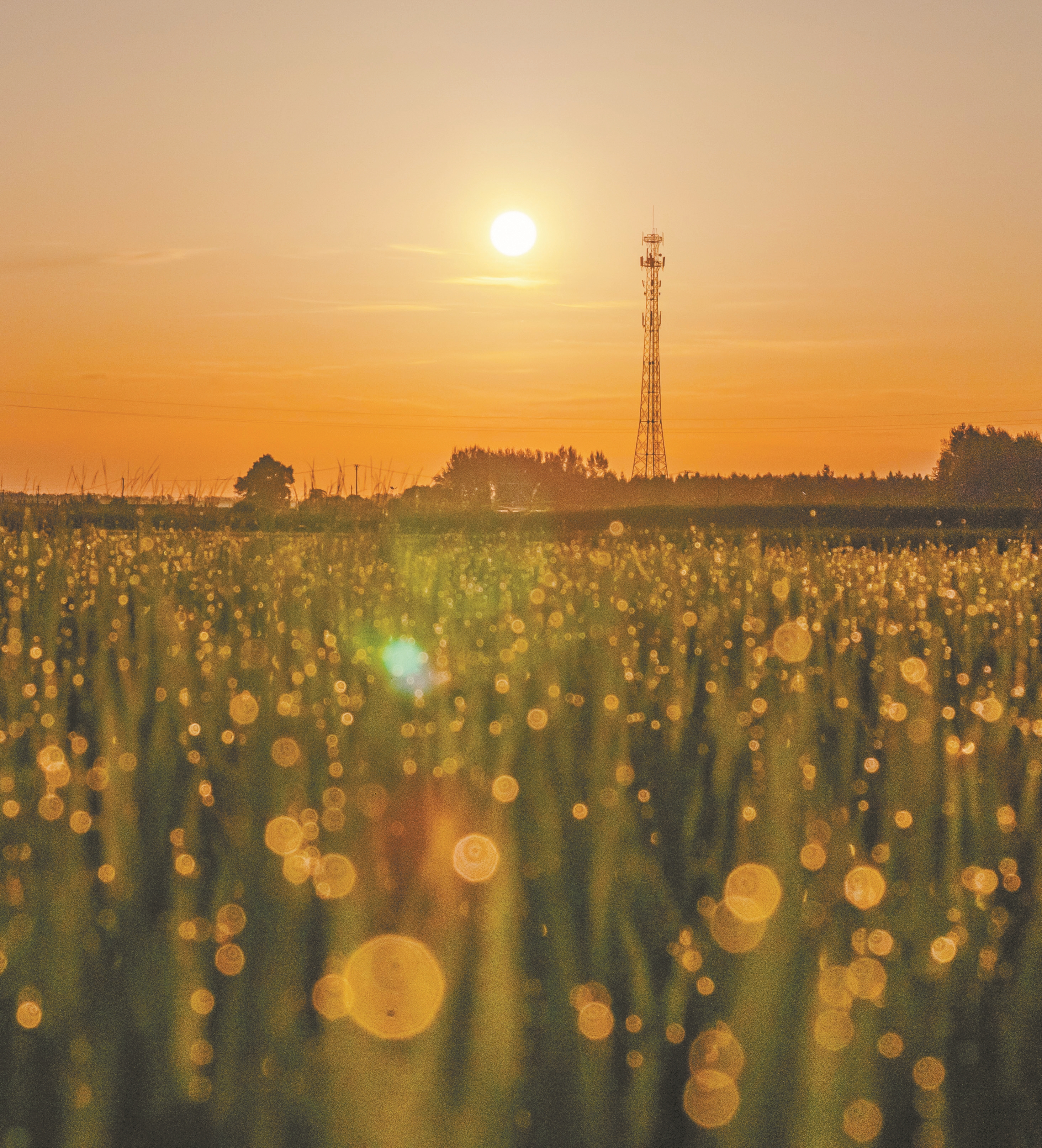 图④为7月4日,在黑龙江省佳木斯市汤原县吉祥乡一片稻田中,年度“最小太阳”与露水相映成趣。(新华社发)