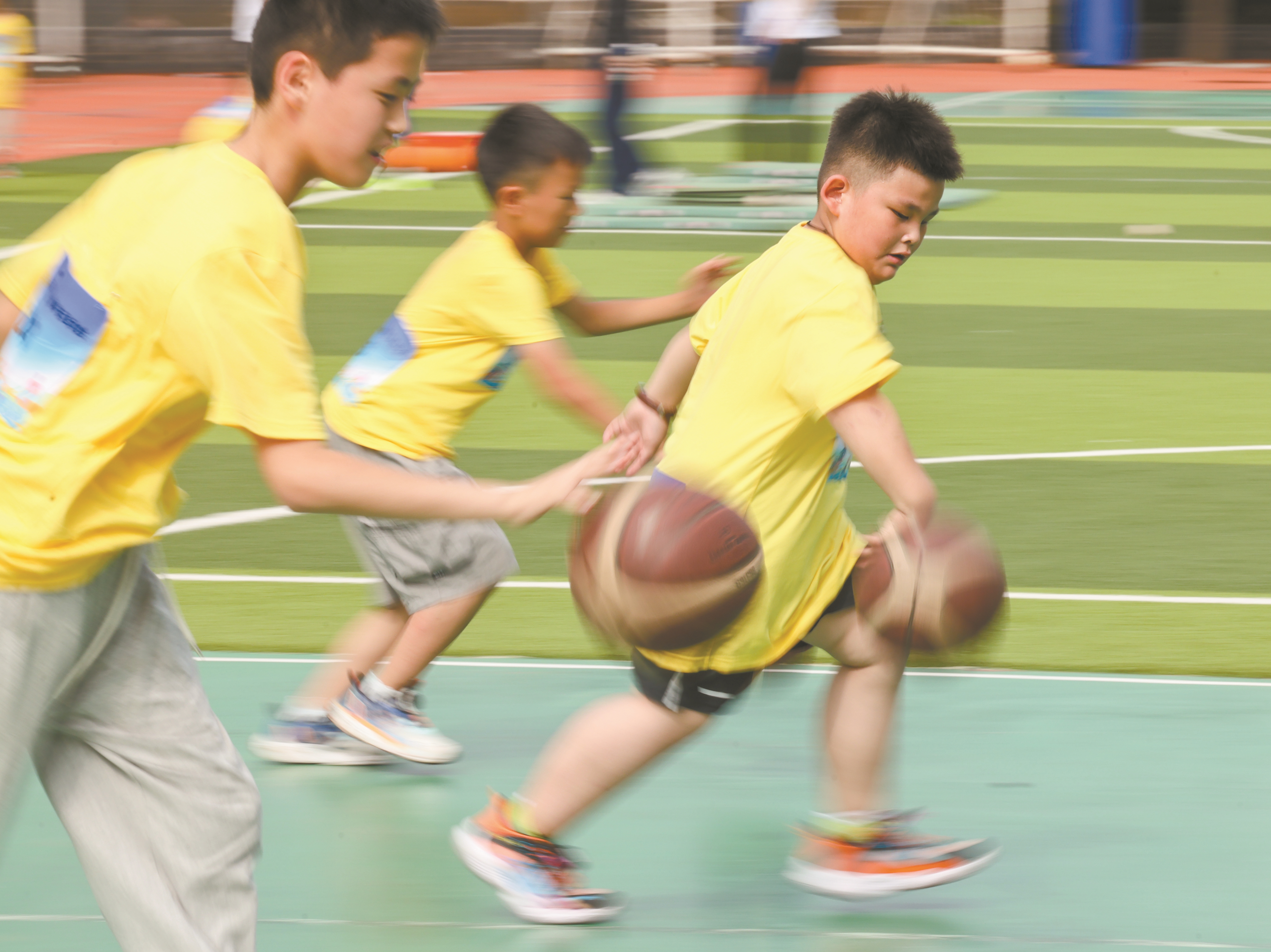 图为在哮喘儿童趣味运动会上,小运动员进行运球跑比赛。