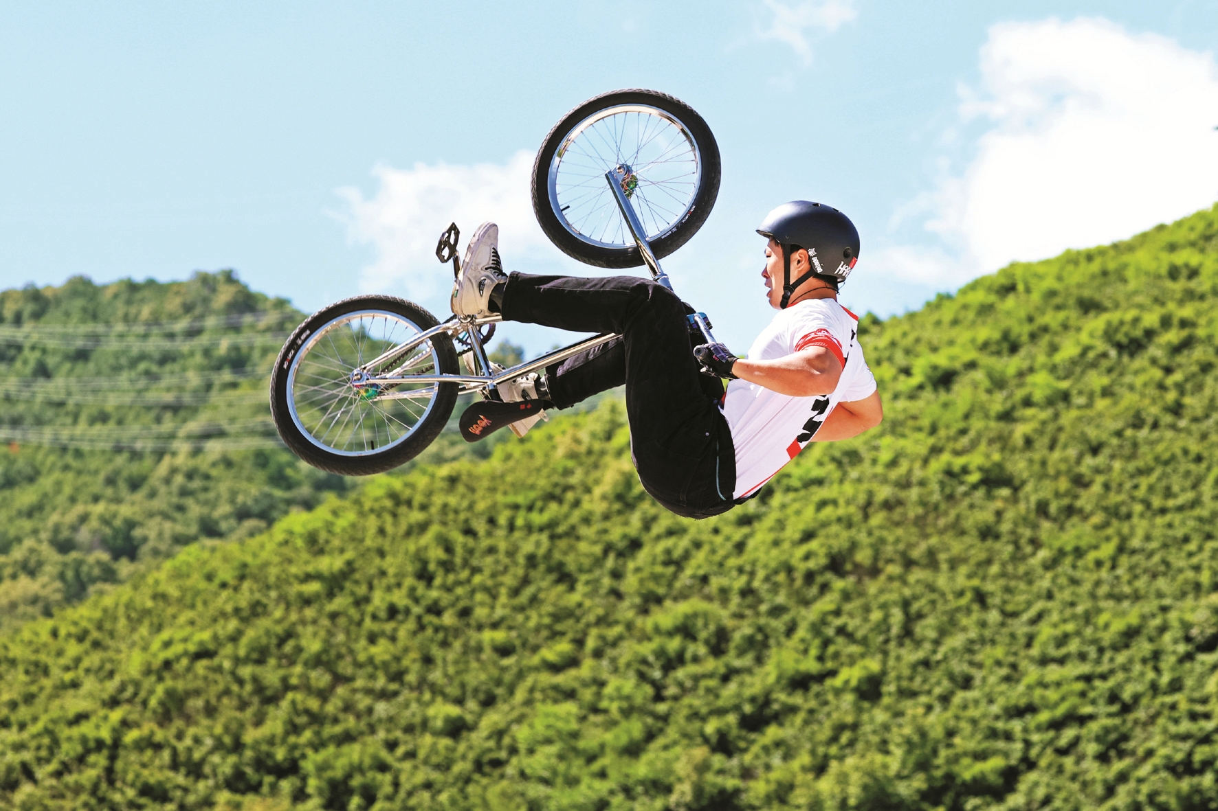 六日,全国自由式小轮车锦标赛暨全国青年自由式小轮车锦标赛精英男子组决赛在河北省张家口市崇礼自行车极限运动公园举行。图为四川队林硕堂在比赛中,他获得第三名。(新华社发)