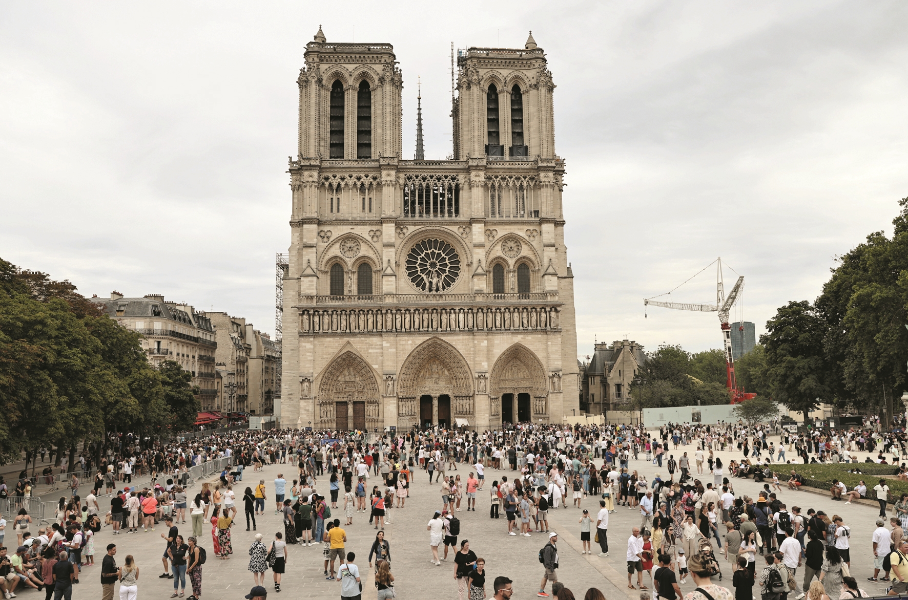 图为7月5日,人们在法国巴黎圣母院前游览。