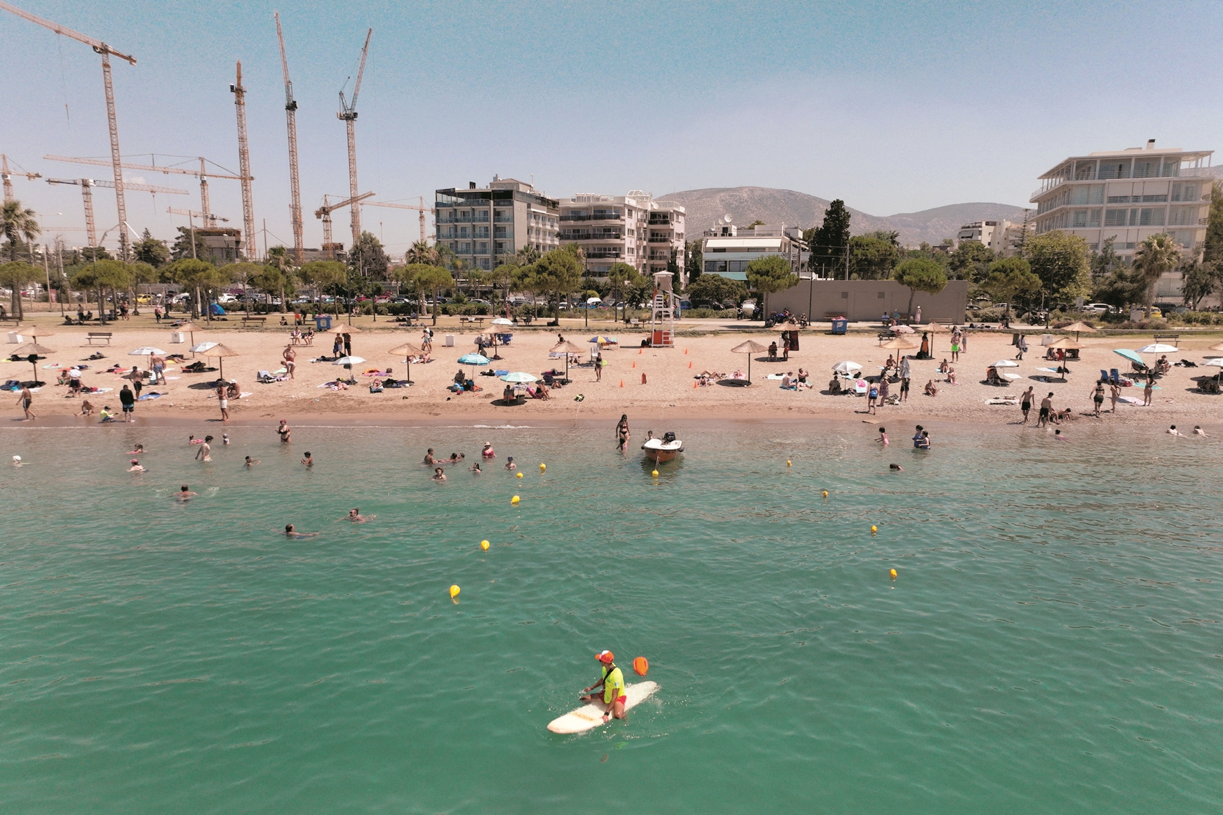 图为7月8日,人们在希腊雅典格利法达海滩休闲(无人机照片)。