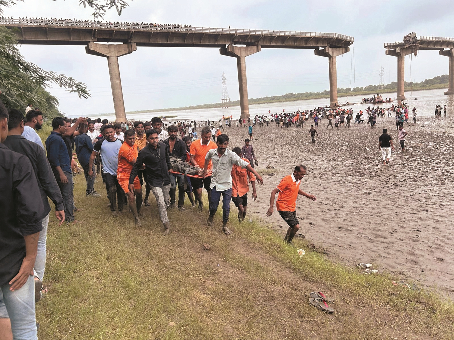 图为7月9日,救援人员在印度西部古吉拉特邦垮塌的桥梁旁开展救援行动。