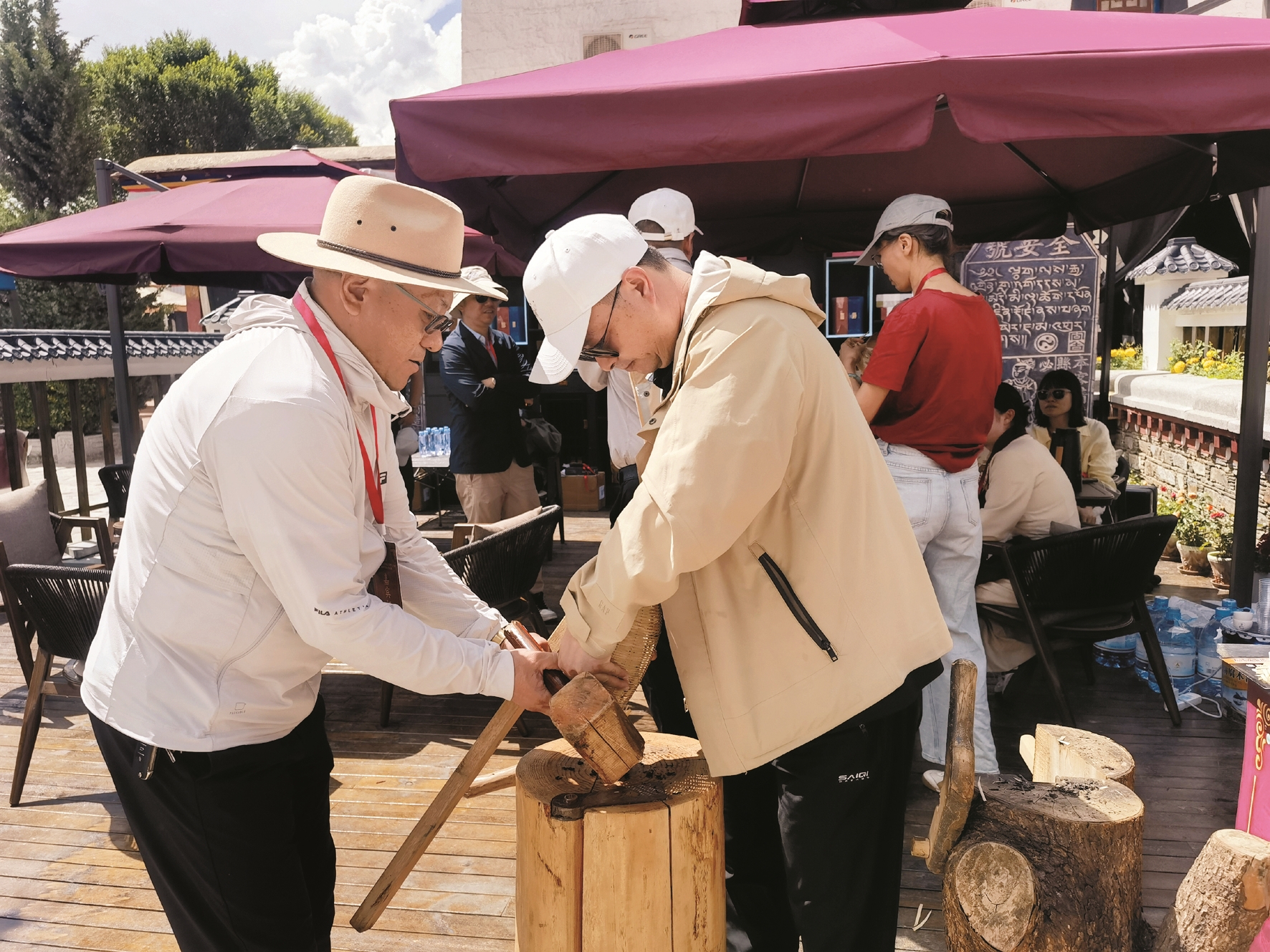 图为嘉宾及游客正在非遗藏茶体验馆体验舂包工艺。 拉萨融媒记者 杨 璐摄