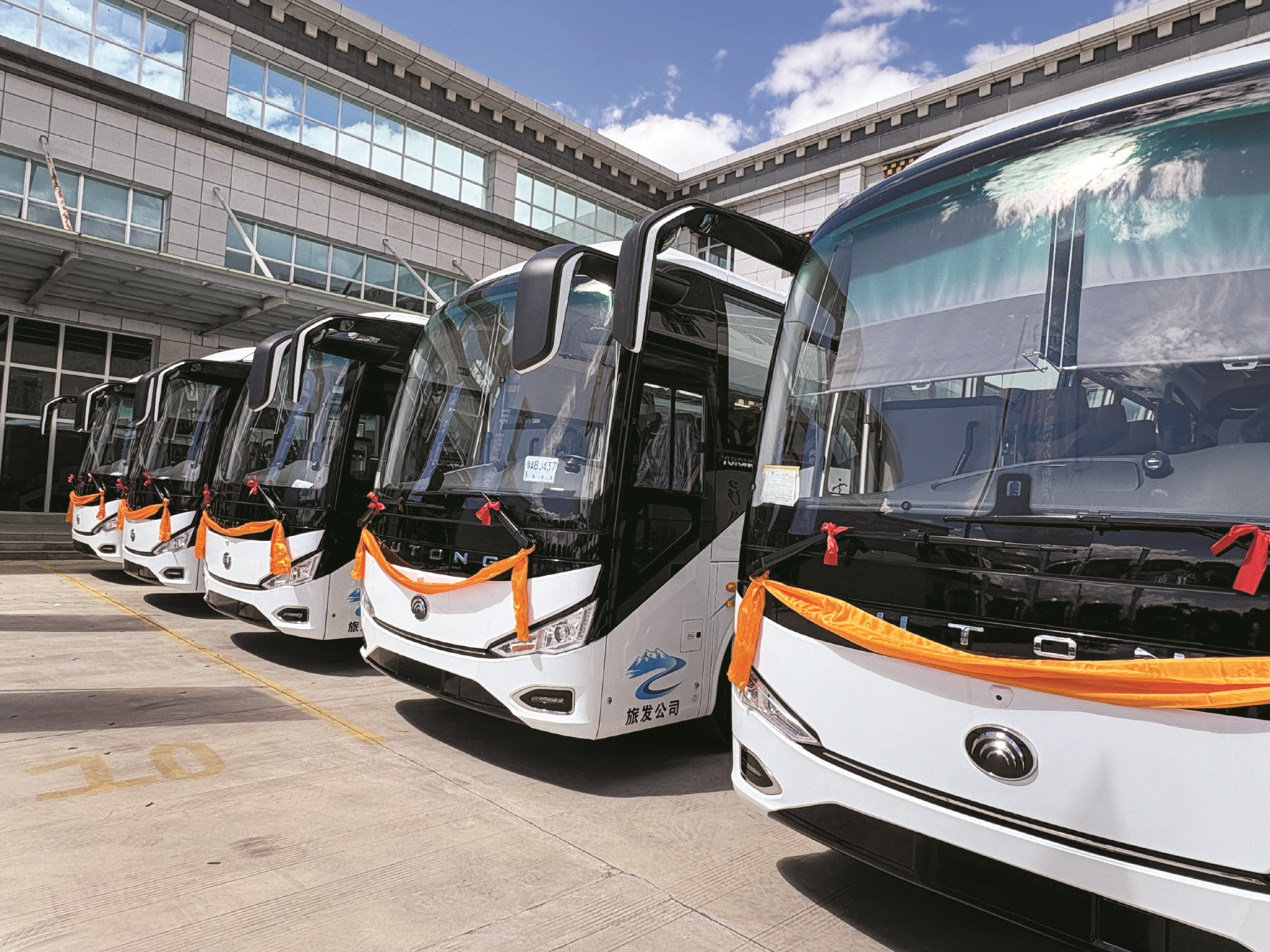 图为具备高原适应性的旅游客车整齐停放。 拉萨融媒记者 仁青拉姆摄