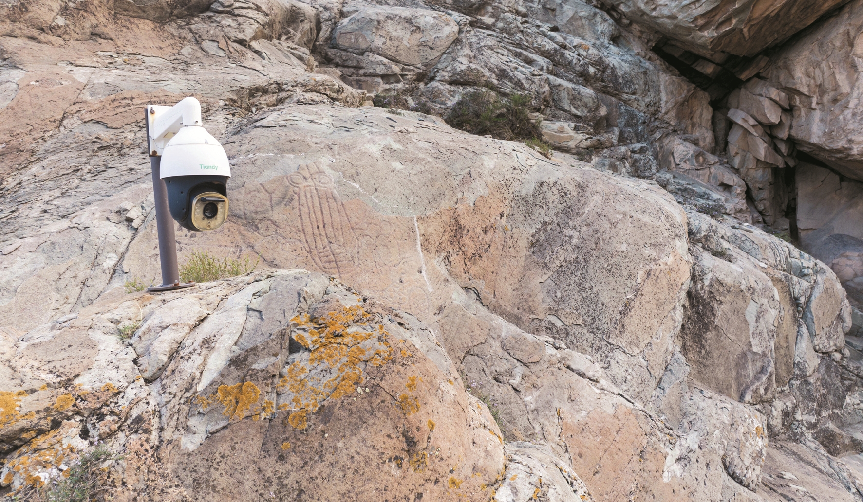 这是7月23日拍摄的贺兰山岩画景区的监控摄像头(无人机照片)。目前,贺兰山岩画景区内有100多个监控摄像头,对岩画情况进行监控。 新华社记者 杨植森摄