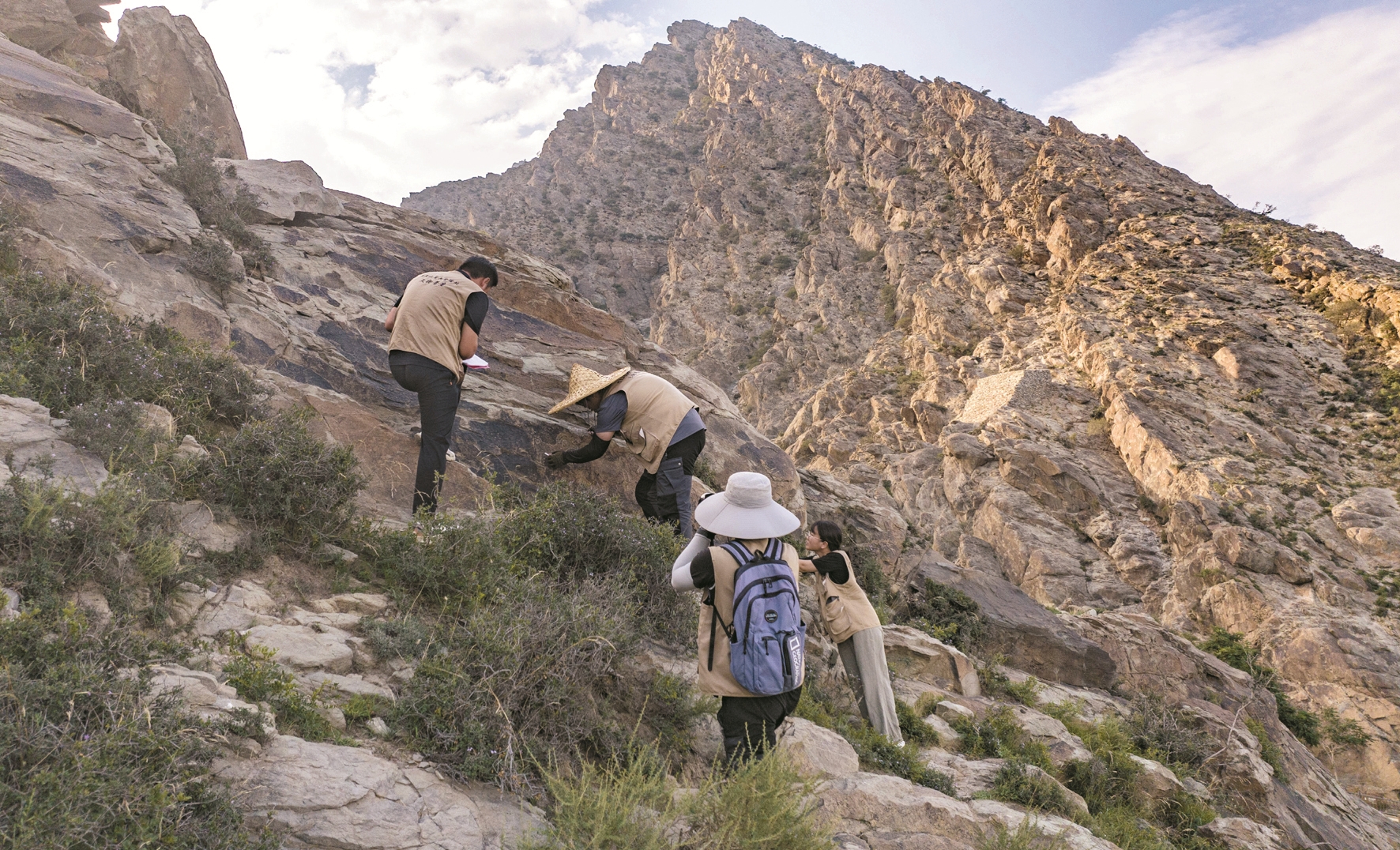 图为7月23日,工作人员在贺兰山岩画遗址区内进行2025年度岩画复查(无人机照片)。新华社记者 杨植森摄
