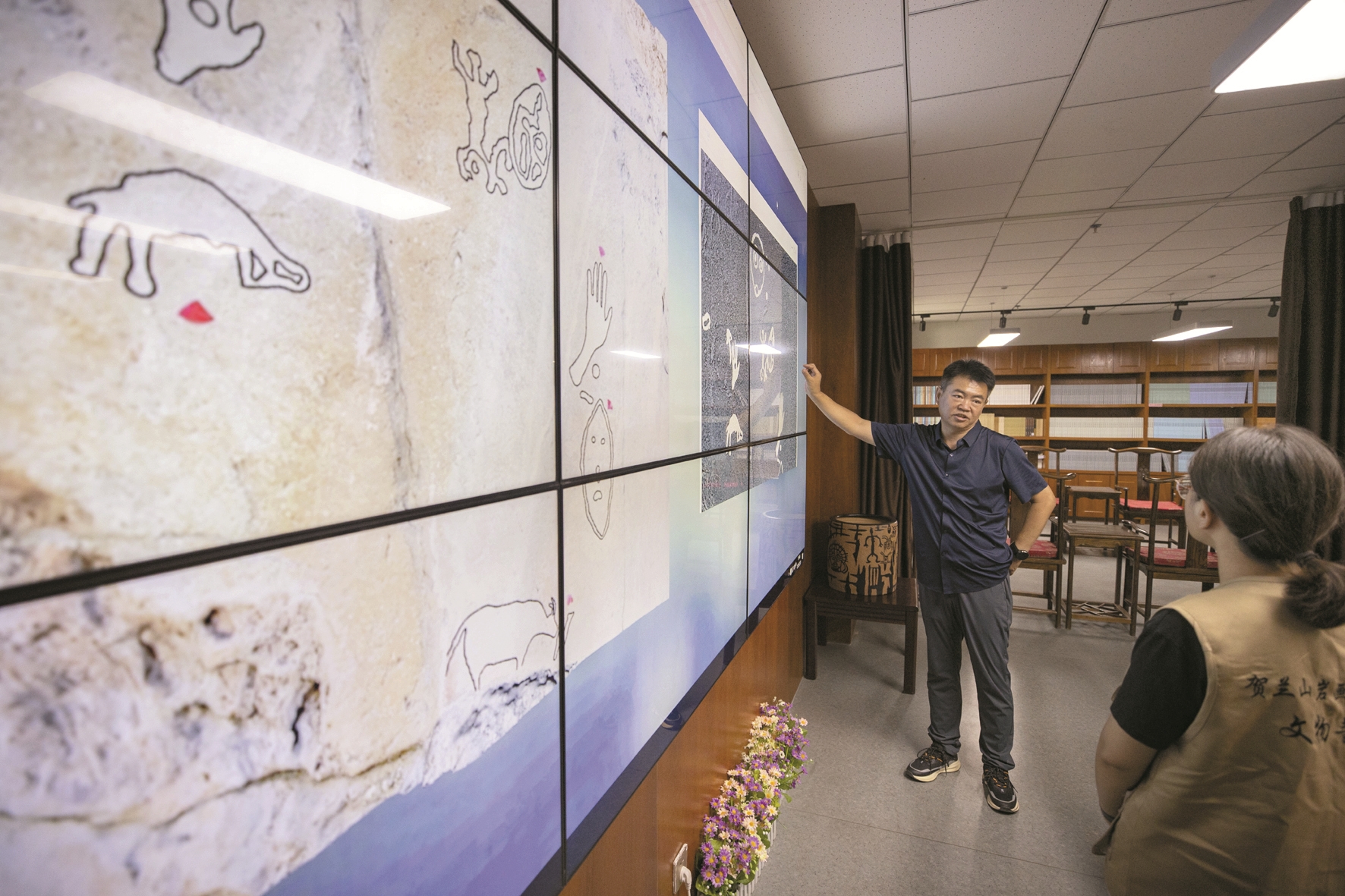 图为7月23日,工作人员在银川世界岩画馆研究室研究贺兰山岩画数字拓片。新华社记者 杨植森摄