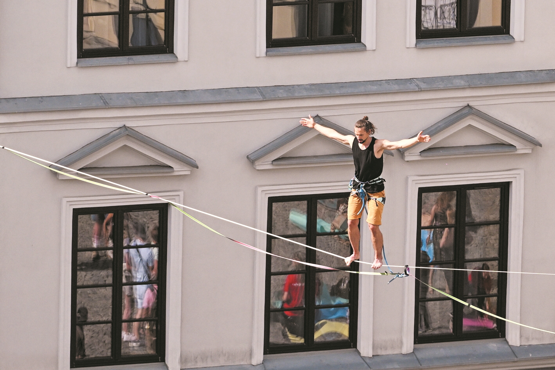 这是7月24日,一名男子在波兰卢布林参加城市高空钢索节活动。(新华社发)